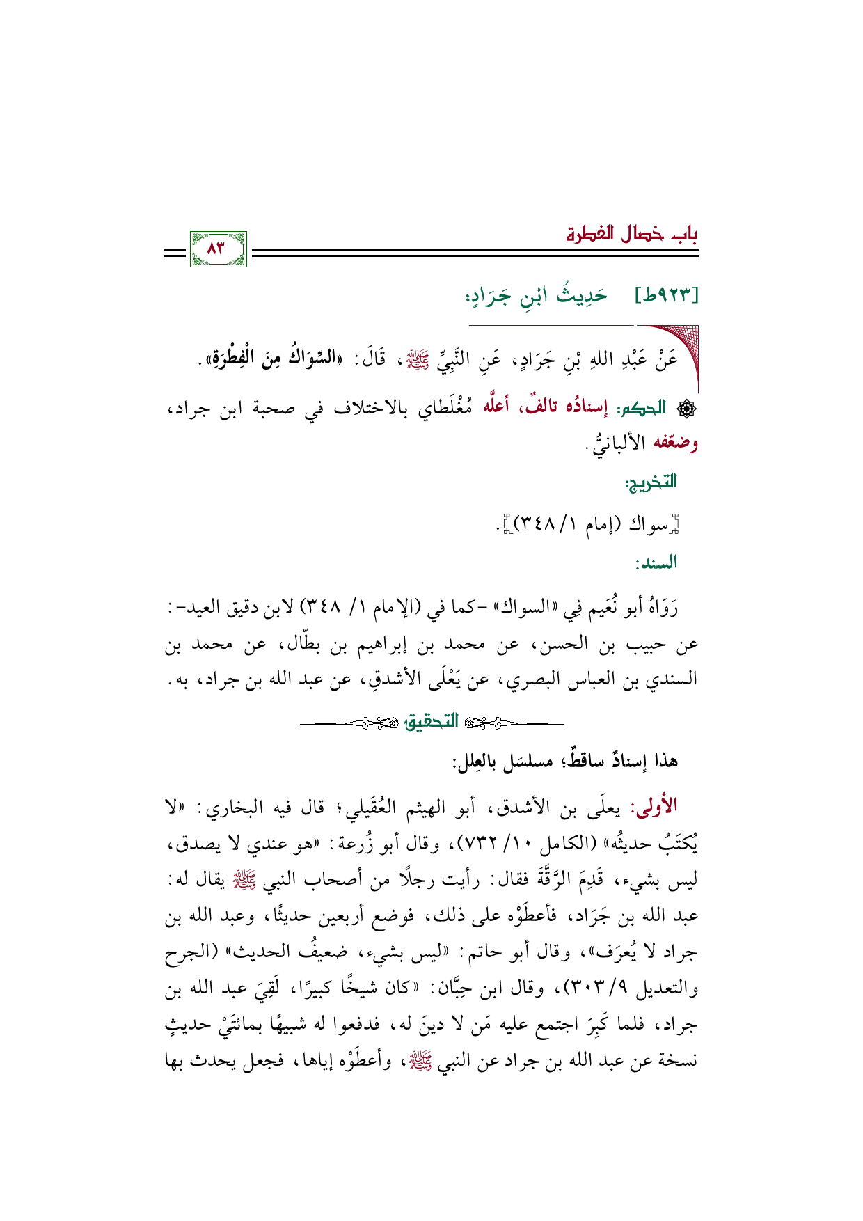 رَوَاهُ أبو نُعَيم فِي "السواك"- كما في (الإمام ١/ ٣٤٨) لابن دقيق العيد-: عن حبيب بن الحسن، عن محمد بن إبراهيم بن بطّال، عن محمد بن السندي بن العباس البصري، عن يَعْلَى الأشدقِ، عن عبد الله بن جراد، به.