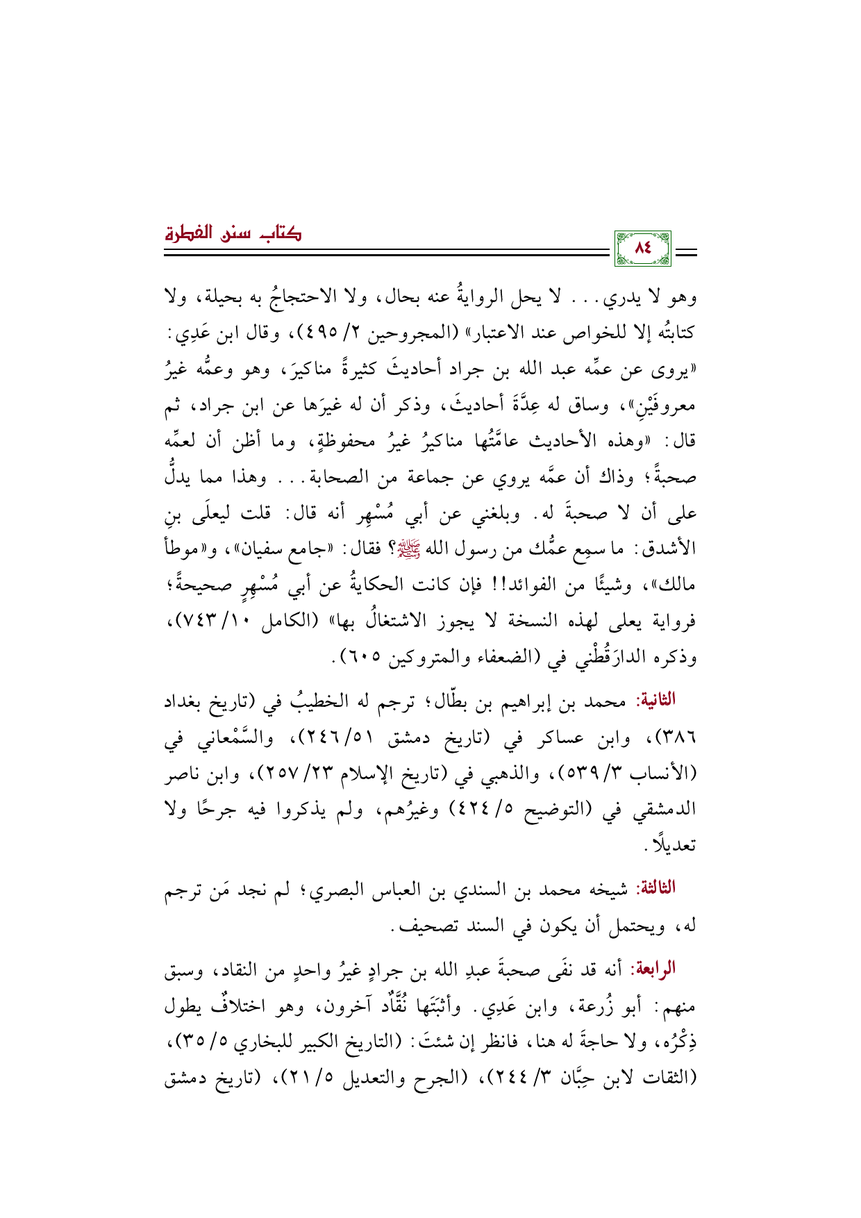 الرابعة: أنه قد نفَى صحبةَ عبدِ الله بن جرادٍ غيرُ واحدٍ من النقاد، وسبق منهم: أبو زُرعة، وابن عَدِي. وأثبَتَها نُقَّادٌ آخرون، وهو اختلافٌ يطول ذِكْرُه، ولا حاجةَ له هنا، فانظر إن شئتَ: (التاريخ الكبير للبخاري ٥/ ٣٥)، (الثقات لابن حِبَّان ٣/ ٢٤٤)، (الجرح والتعديل ٥/ ٢١)، (تاريخ دمشق