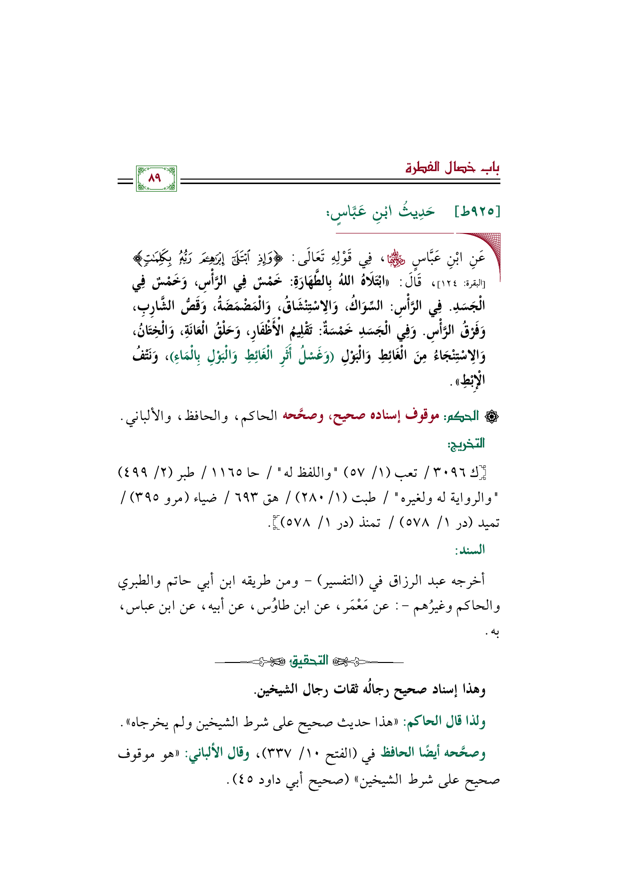 وصحَّحه أيضًا الحافظ في (الفتح ١٠/ ٣٣٧)، وقال الألباني: "هو موقوف صحيح على شرط الشيخين" (صحيح أبي داود ٤٥).