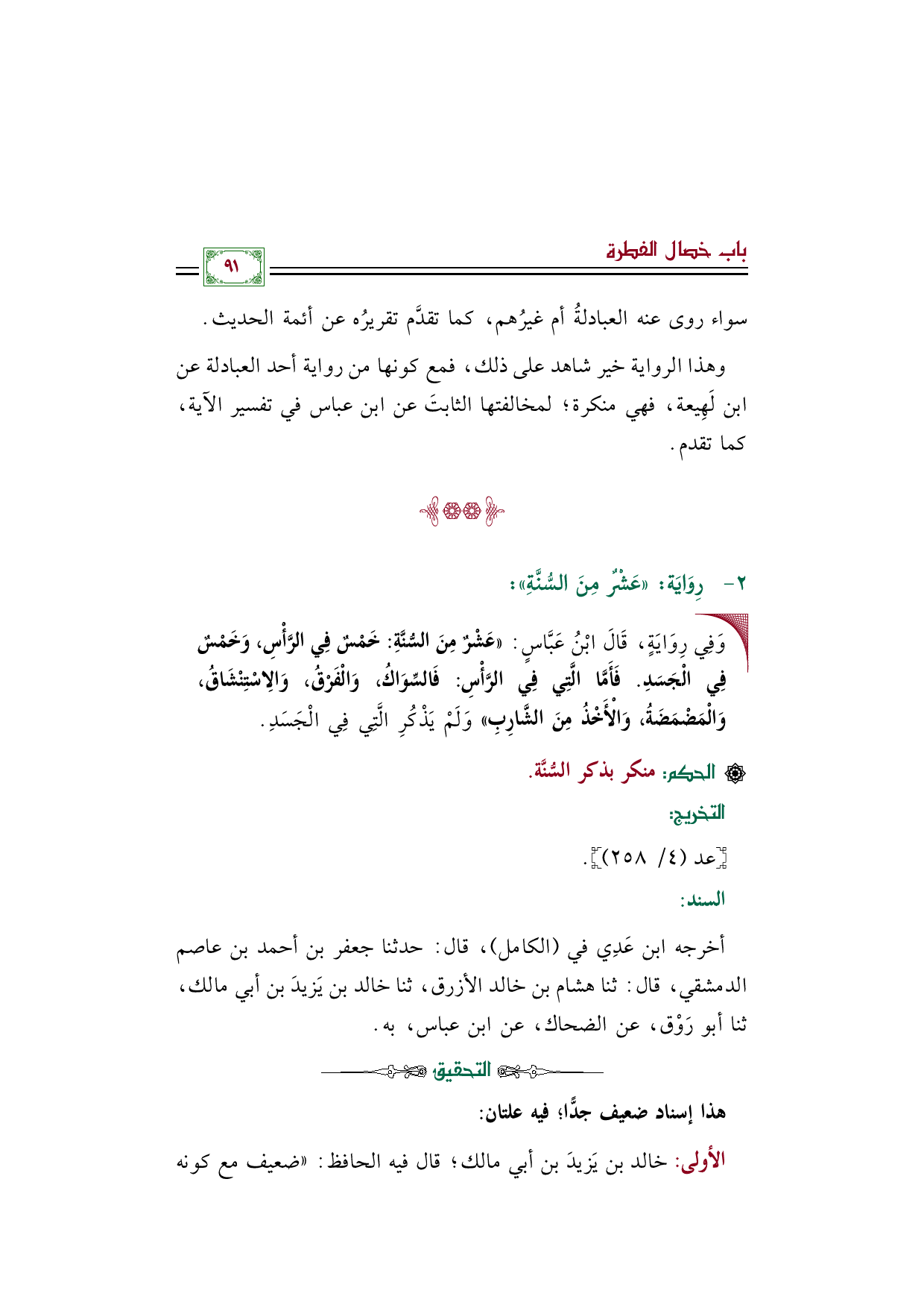 الأولى: خالد بن يَزيدَ بن أبي مالك؛ قال فيه الحافظ: "ضعيف مع كونه