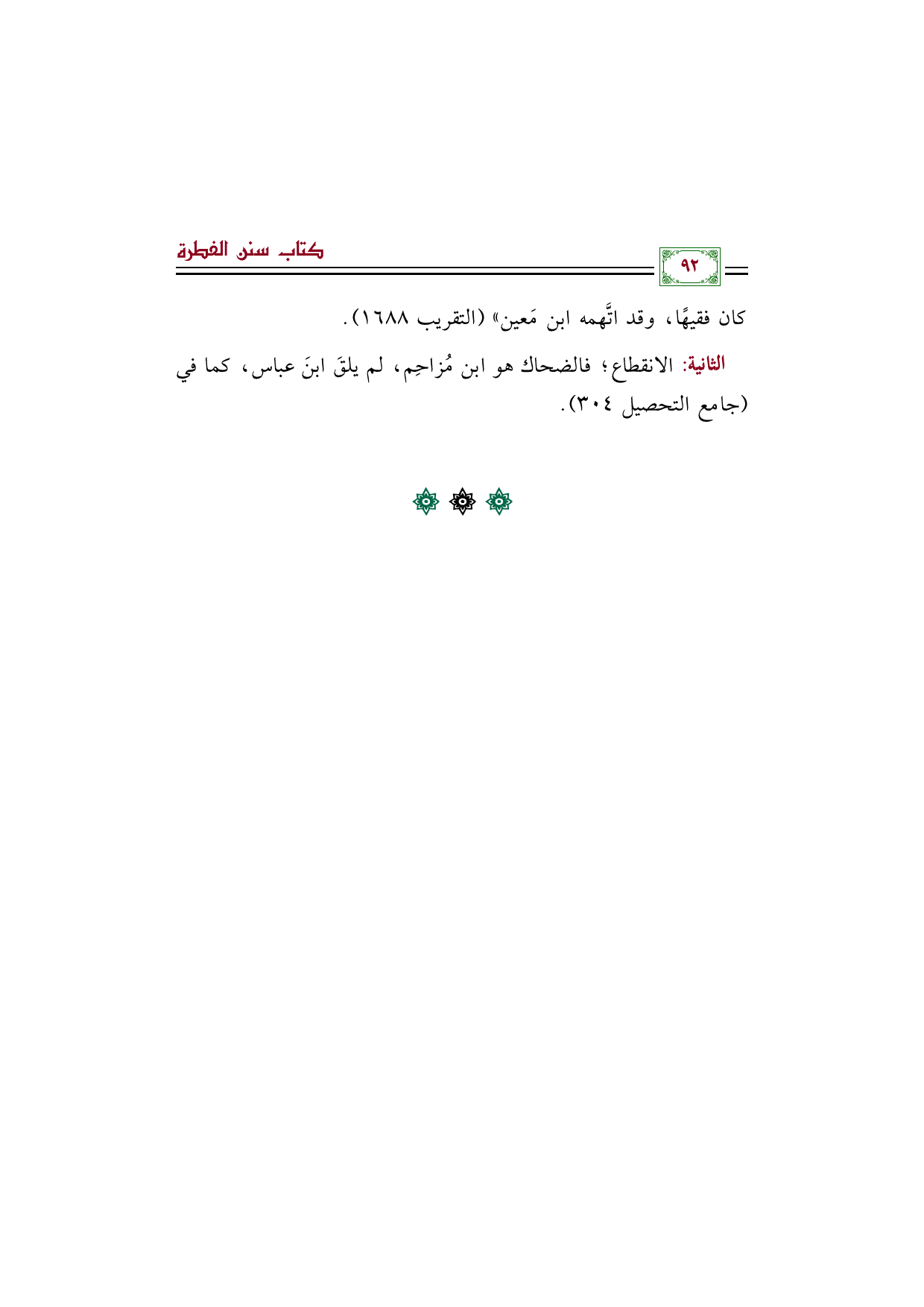 الثانية: الانقطاع؛ فالضحاك هو ابن مُزاحِم، لم يلقَ ابنَ عباس، كما في (جامع التحصيل ٣٠٤).