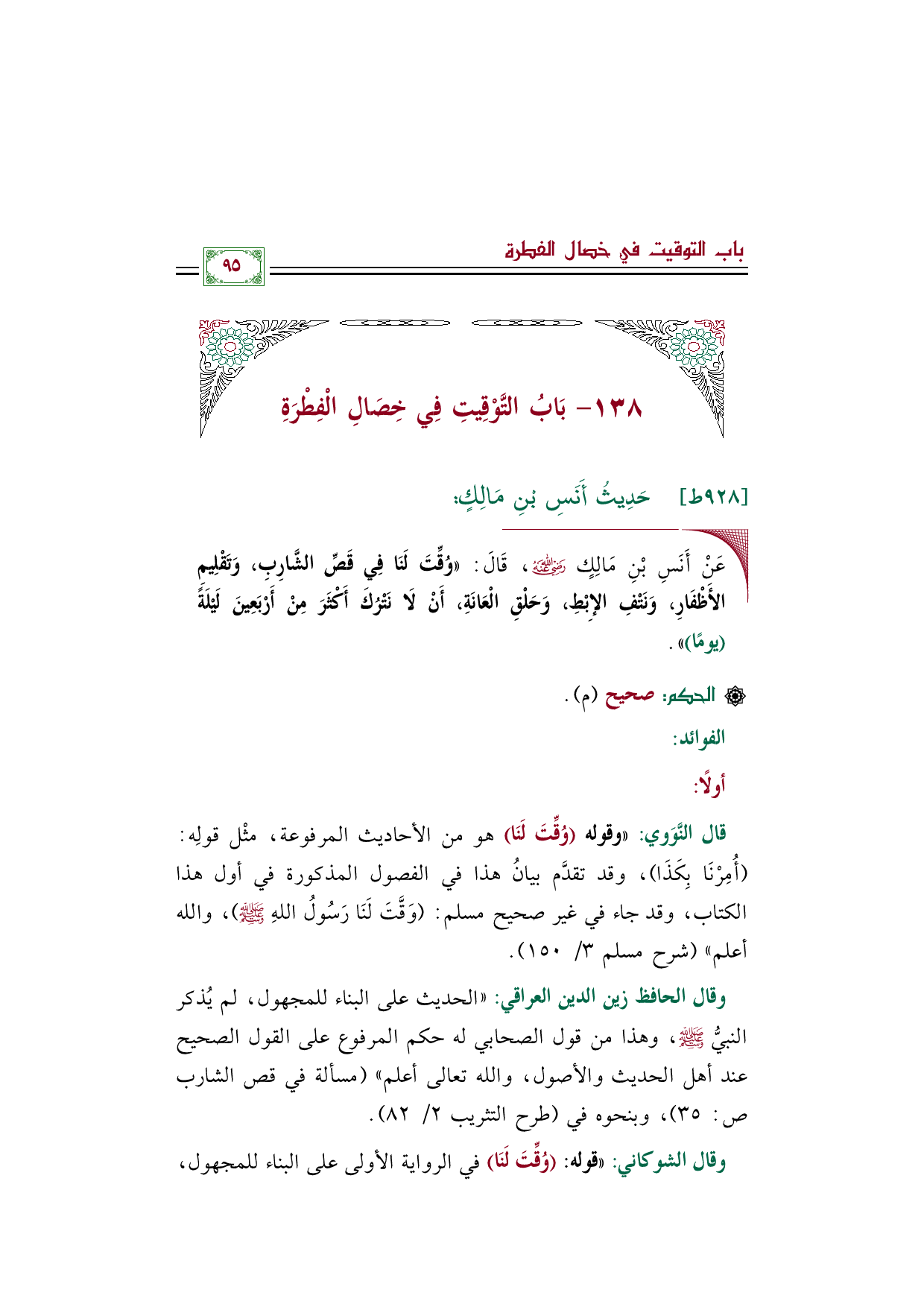 قال النَّوَوي: "وقوله (وُقِّتَ لَنَا) هو من الأحاديث المرفوعة، مثْل قولِه: (أُمِرْنَا بِكَذَا)، وقد تقدَّم بيانُ هذا في الفصول المذكورة في أول هذا الكتاب، وقد جاء في غير صحيح مسلم: (وَقَّتَ لَنَا رَسُولُ اللهِ صَلَّى اللهُ عَلَيْهِ وَسَلَّمَ)، والله أعلم" (شرح مسلم ٣/ ١٥٠).