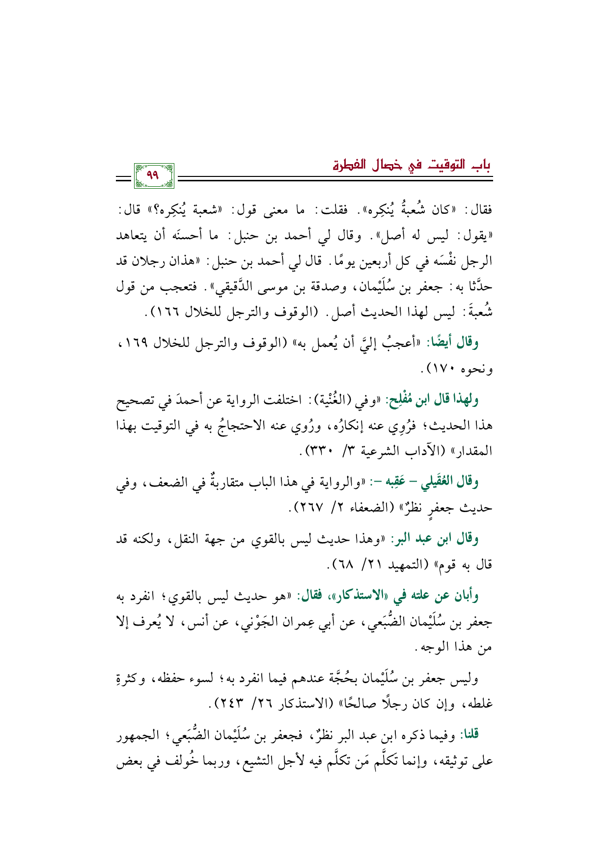 فقال: "كان شُعبةُ يُنكِره". فقلت: ما معنى قول: "شعبة يُنكِره؟ " قال: "يقول: ليس له أصل". وقال لي أحمد بن حنبل: ما أحسنَه أن يتعاهد الرجل نفْسَه في كل أربعين يومًا. قال لي أحمد بن حنبل: "هذان رجلان قد حدَّثا به: جعفر بن سُلَيْمان، وصدقة بن موسى الدَّقيقي". فتعجب من قول شُعبةَ: ليس لهذا الحديث أصل. (الوقوف والترجل للخلال ١٦٦).