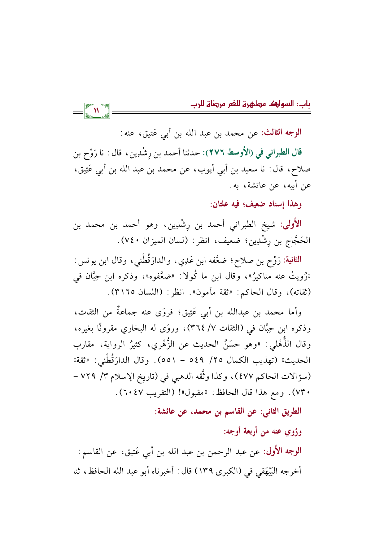 قال الطبراني في (الأوسط ٢٧٦): حدثنا أحمد بن رِشْدِين، قال: نا رَوْح بن صلاح، قال: نا سعيد بن أبي أيوب، عن محمد بن عبد الله بن أبي عَتِيق، عن أبيه، عن عائشة، به.