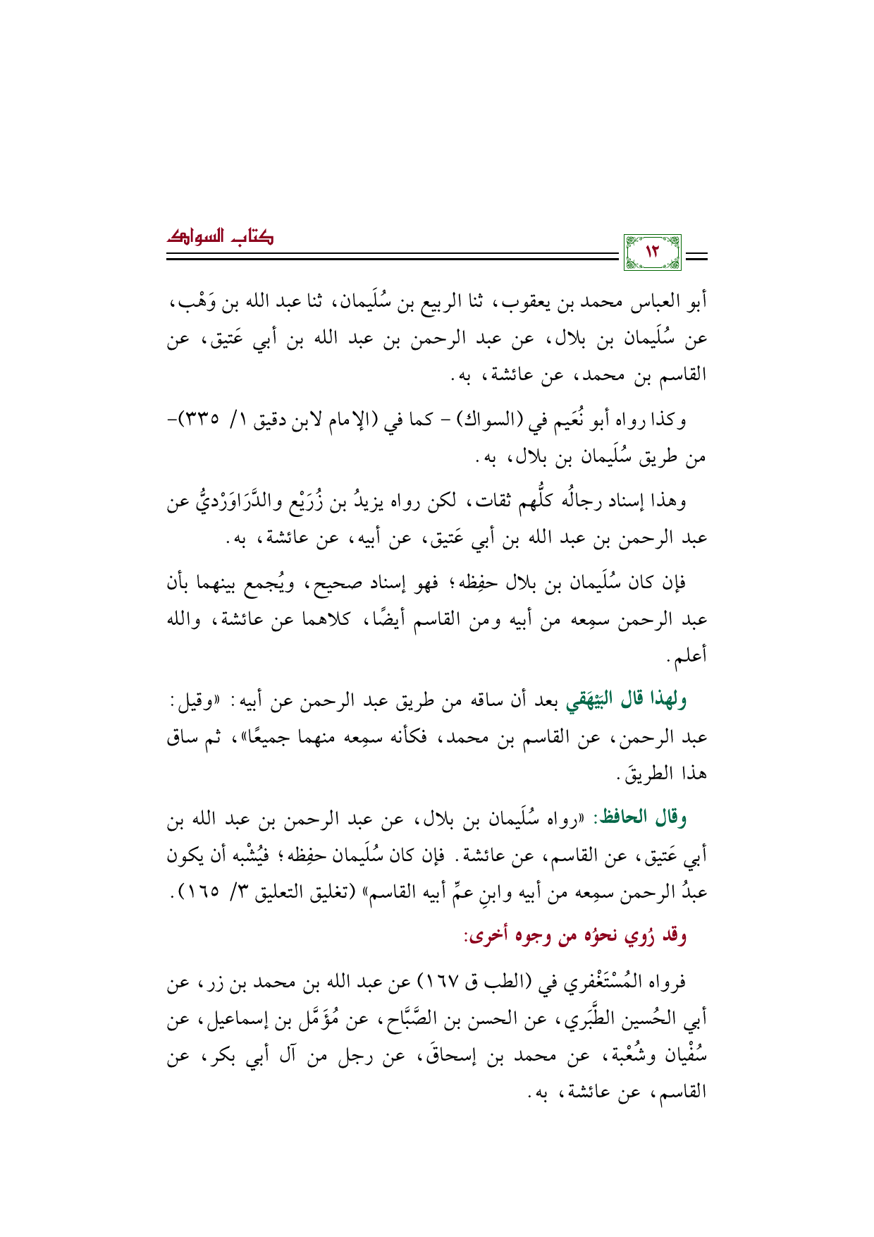 وكذا رواه أبو نُعَيم في "السواك"- كما في (الإمام لابن دقيق ١/ ٣٣٥) - من طريق سُلَيمان بن بلال، به.
