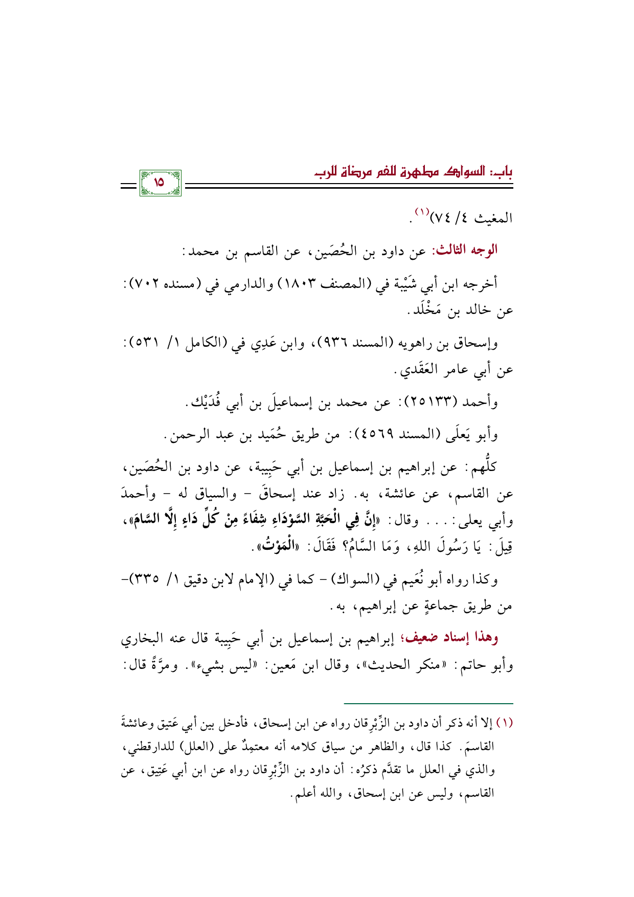 كلُّهم: عن إبراهيم بن إسماعيل بن أبي حَبِيبة، عن داود بن الحُصَين، عن القاسم، عن عائشة، به. زاد عند إسحاقَ- والسياق له- وأحمدَ وأبي يعلى: ... وقال: ((إِنَّ فِي الْحَبَّةِ السَّوْدَاءِ شِفَاءً مِنْ كُلِّ دَاءٍ إِلَّا السَّامَ))، قِيلَ: يَا رَسُولَ اللهِ، وَمَا السَّامُ؟ فَقَالَ: ((الْمَوْتُ)).