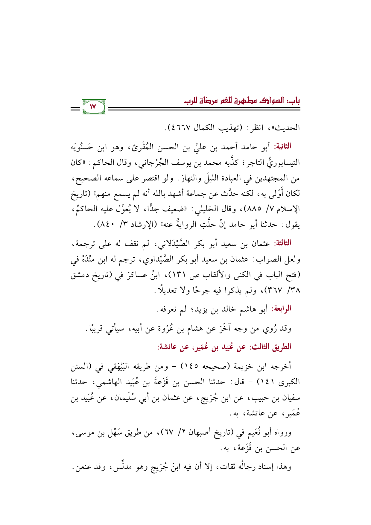 أخرجه ابن خزيمة (صحيحه ١٤٥) - ومن طريقه البَيْهَقي في (السنن الكبرى ١٤١) - قال: حدثنا الحسن بن قَزَعةَ بن عُبَيد الهاشمي، حدثنا سفيان بن حبيب، عن ابن جُرَيج، عن عثمان بن أبي سُلَيمان، عن عُبَيد بن عُمَير، عن عائشة، به.