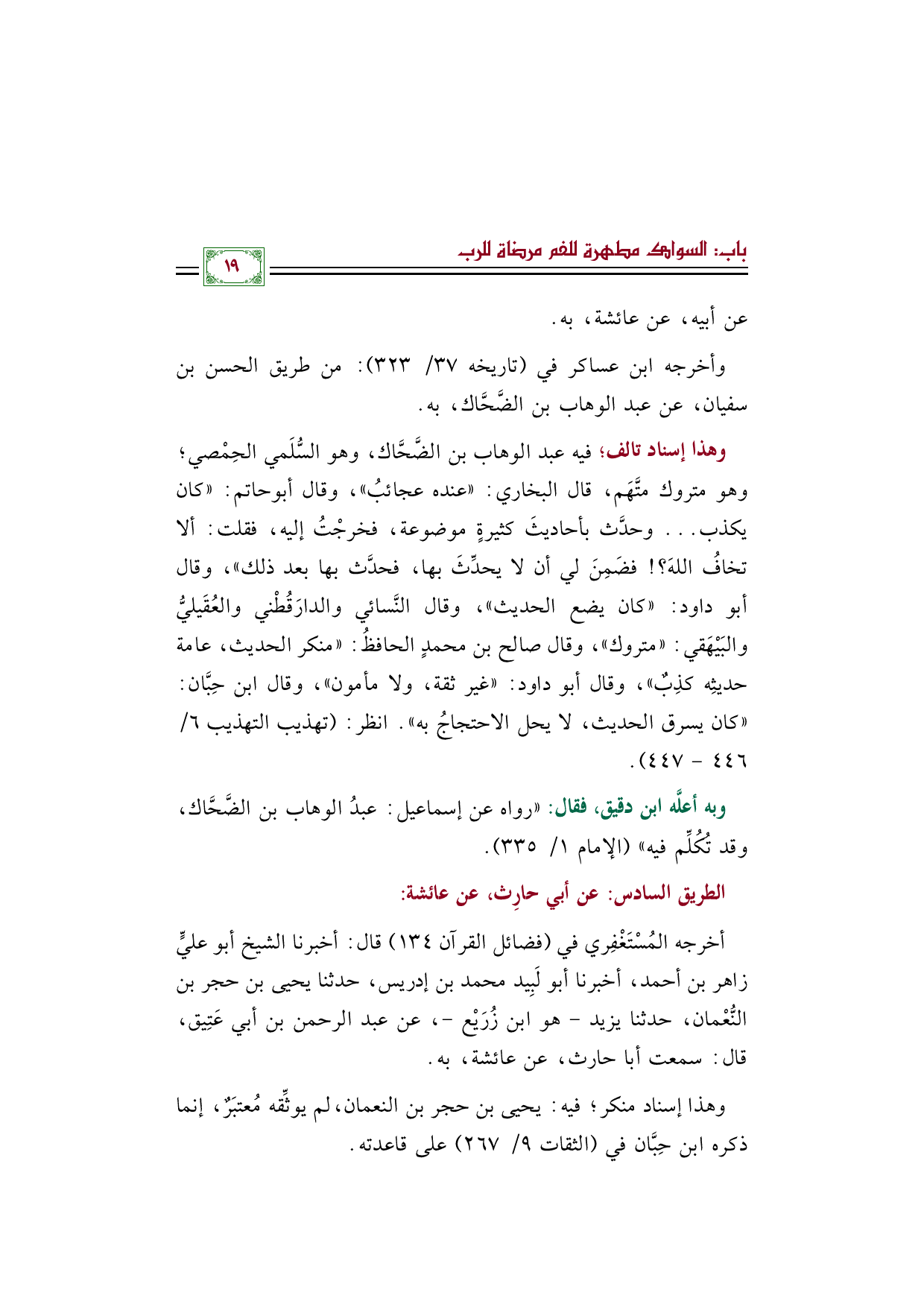 أخرجه المُسْتَغْفِري في (فضائل القرآن ١٣٤) قال: أخبرنا الشيخ أبو عليٍّ زاهر بن أحمد، أخبرنا أبو لَبِيد محمد بن إدريس، حدثنا يحيى بن حجر بن النُّعْمان، حدثنا يزيد- هو ابن زُرَيْع-، عن عبد الرحمن بن أبي عَتِيق، قال: سمعت أبا حارث، عن عائشة، به.