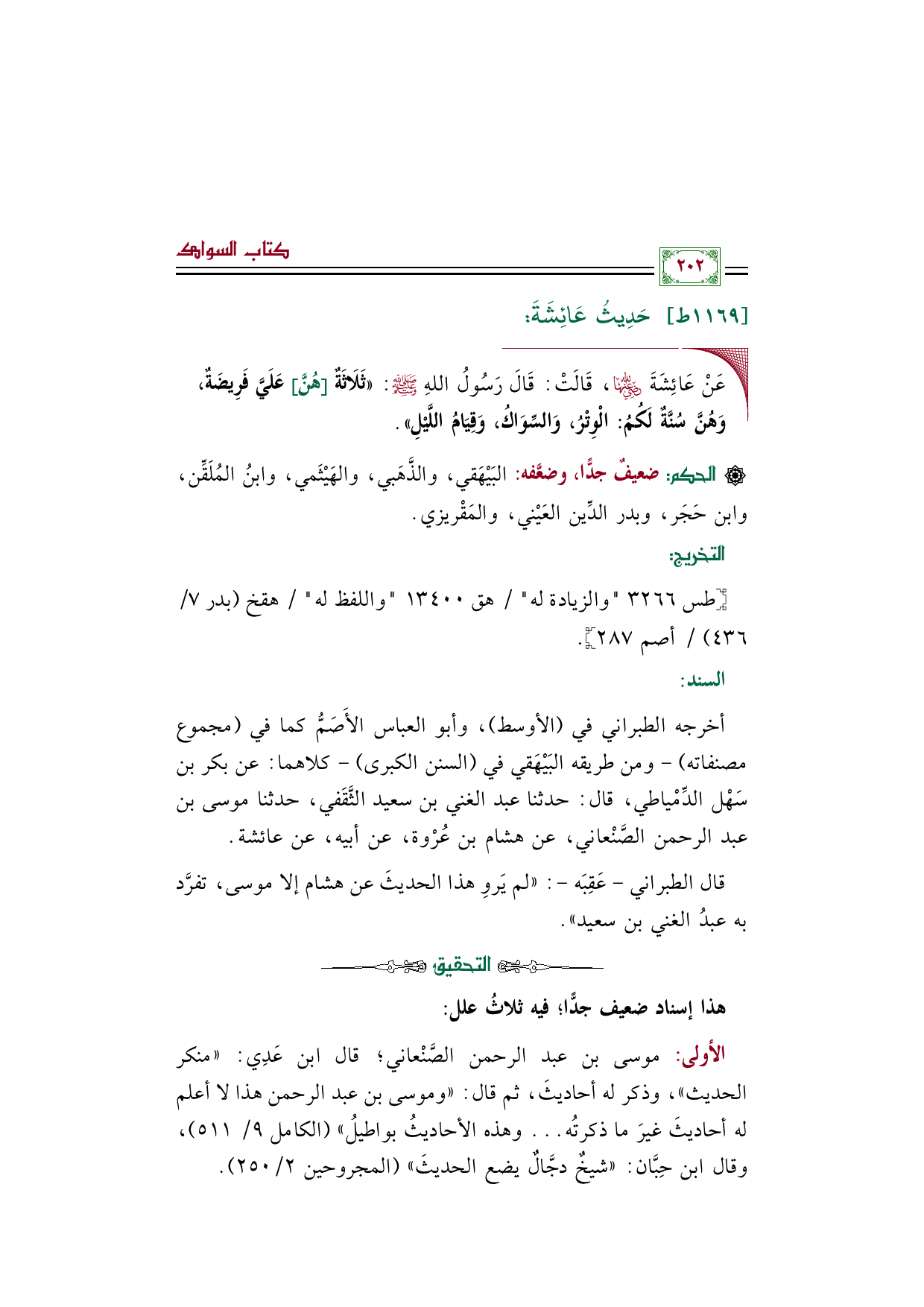 أخرجه الطبراني في (الأوسط)، وأبو العباس الأَصَمُّ كما في (مجموع مصنفاته) - ومن طريقه البَيْهَقي في (السنن الكبرى) - كلاهما: عن بكر بن سَهْل الدِّمْياطي، قال: حدثنا عبد الغني بن سعيد الثَّقَفي، حدثنا موسى بن عبد الرحمن الصَّنْعاني، عن هشام بن عُرْوة، عن أبيه، عن عائشة.