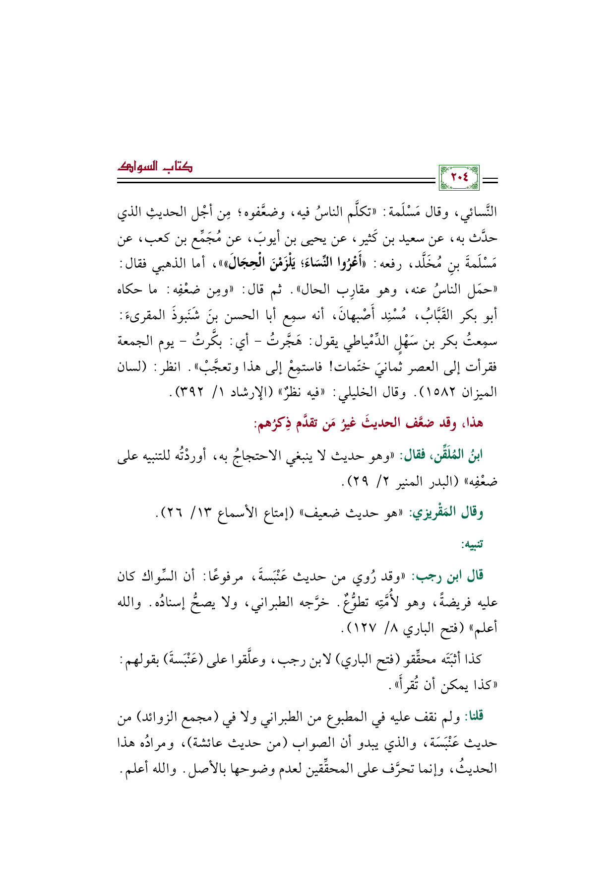 قلنا: ولم نقف عليه في المطبوع من الطبراني ولا في (مجمع الزوائد) من حديث عَنْبَسَة، والذي يبدو أن الصواب (من حديث عائشة)، ومرادُه هذا الحديثُ، وإنما تحرَّف على المحقِّقين لعدم وضوحها بالأصل. والله أعلم.