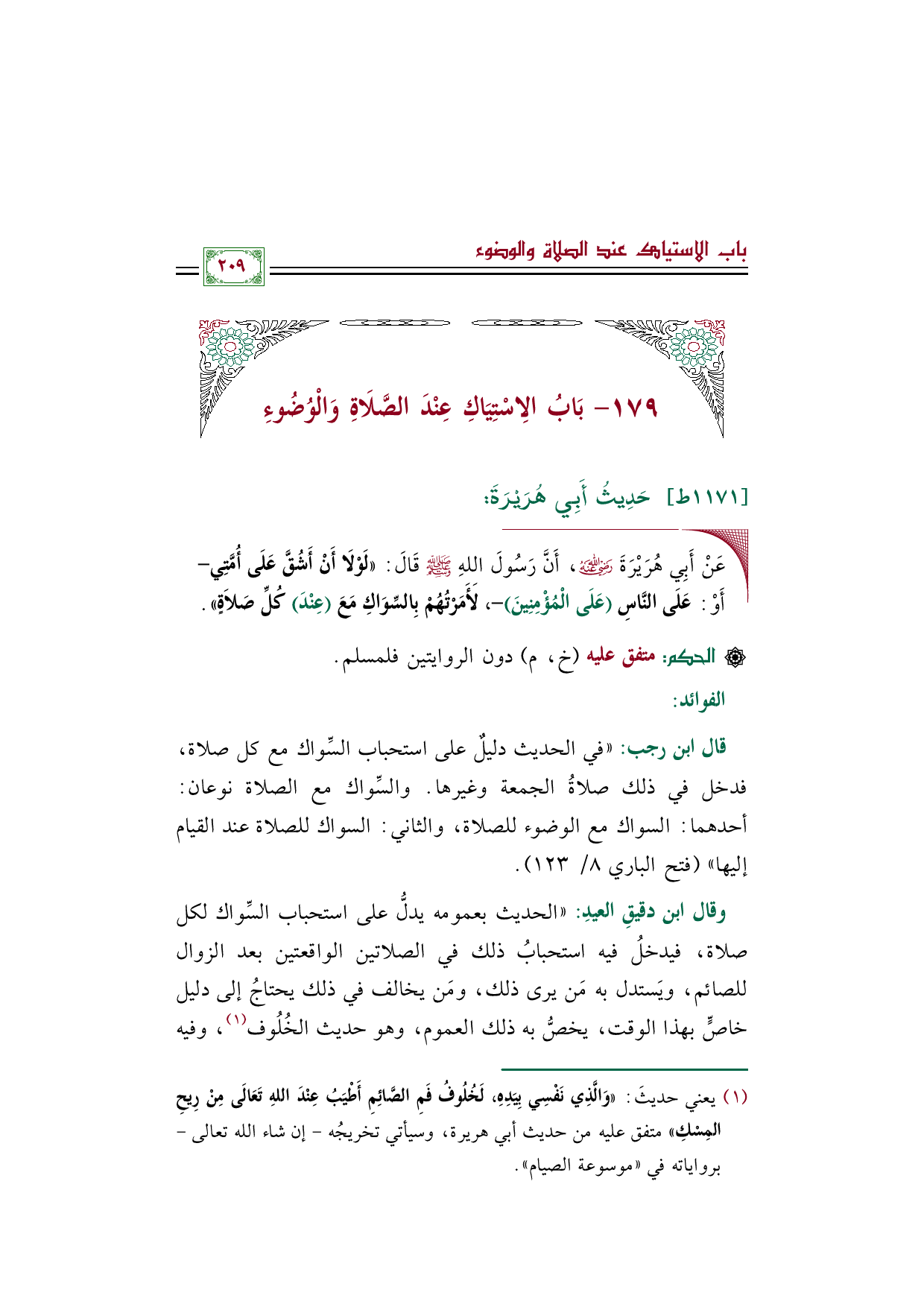 (¬١) يعني حديثَ: «وَالَّذِي نَفْسِي بِيَدِهِ، لَخُلُوفُ فَمِ الصَّائِمِ أَطْيَبُ عِنْدَ اللهِ تَعَالَى مِنْ رِيحِ المِسْكِ» متفق عليه من حديث أبي هريرة، وسيأتي تخريجُه - إن شاء الله تعالى - برواياته في "موسوعة الصيام".