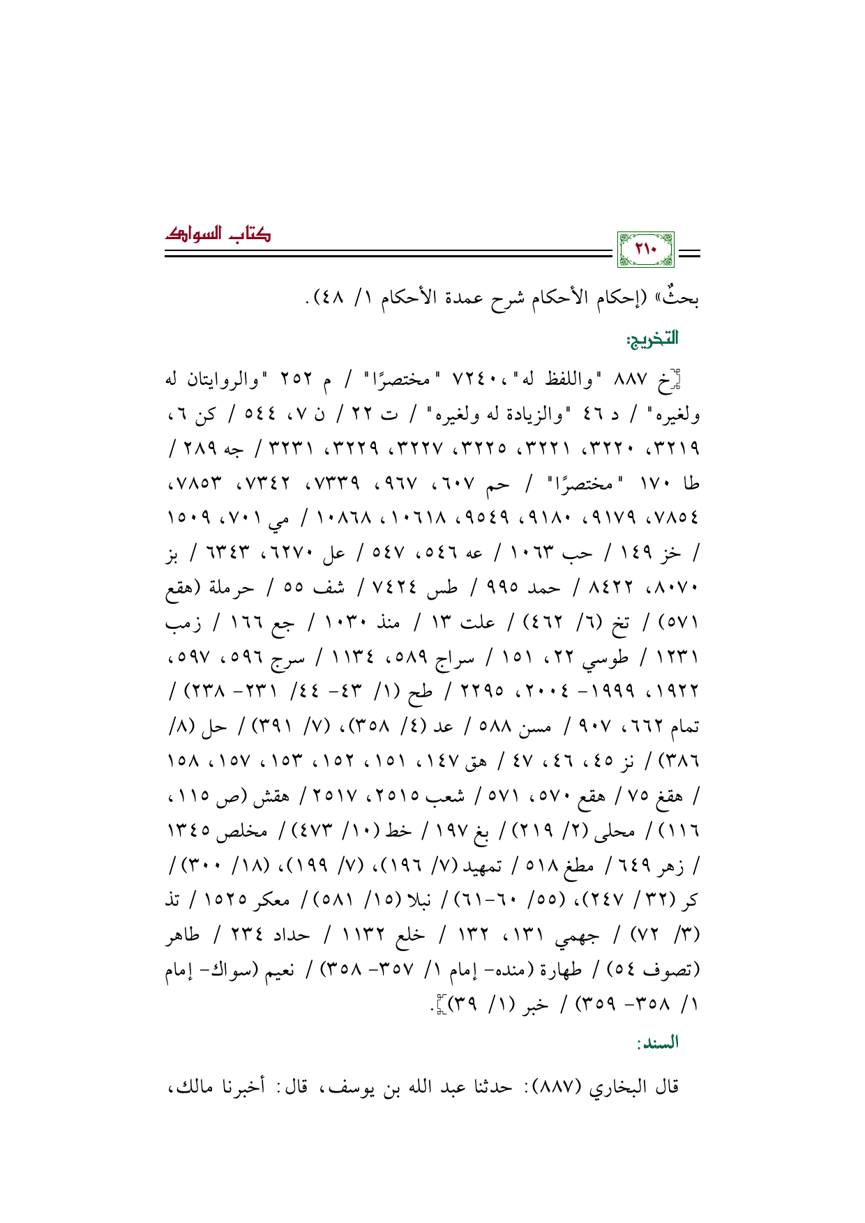 بحثٌ" (إحكام الأحكام شرح عمدة الأحكام ١/ ٤٨).