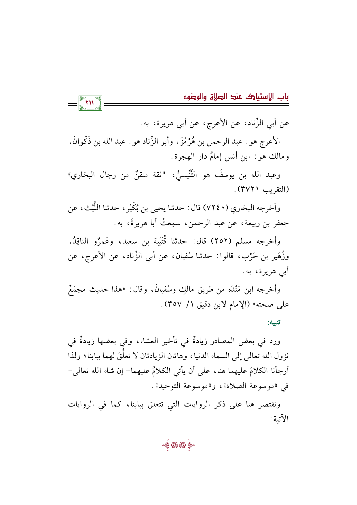 الأعرج هو: عبد الرحمن بن هُرْمُزَ، وأبو الزِّناد هو: عبد الله بن ذَكْوانَ، ومالك هو: ابن أنس إمامُ دار الهجرة.