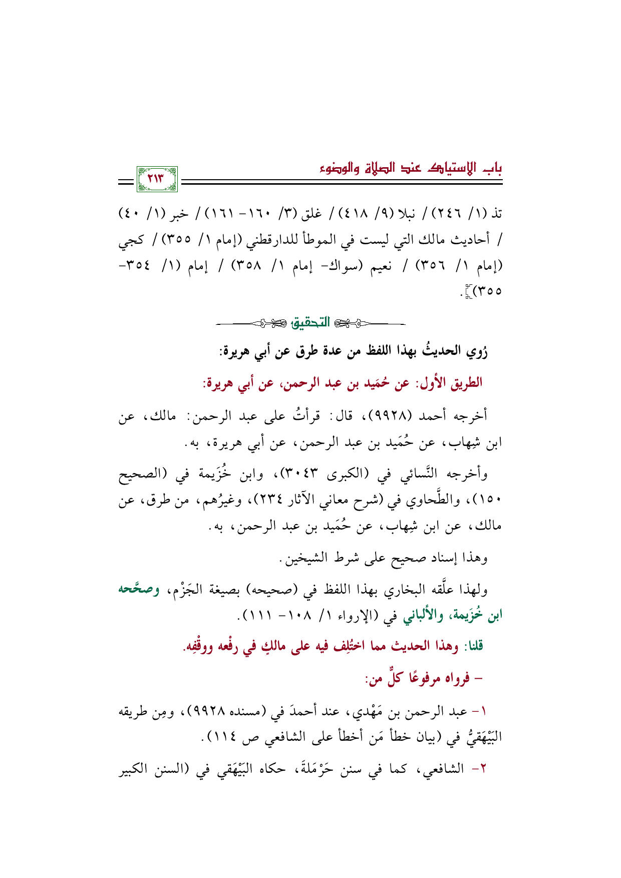 وأخرجه النَّسائي في (الكبرى ٣٠٤٣)، وابن خُزَيمة في (الصحيح ١٥٠)، والطَّحاوي في (شرح معاني الآثار ٢٣٤)، وغيرُهم، من طرق، عن مالك، عن ابن شِهاب، عن حُمَيد بن عبد الرحمن، به.