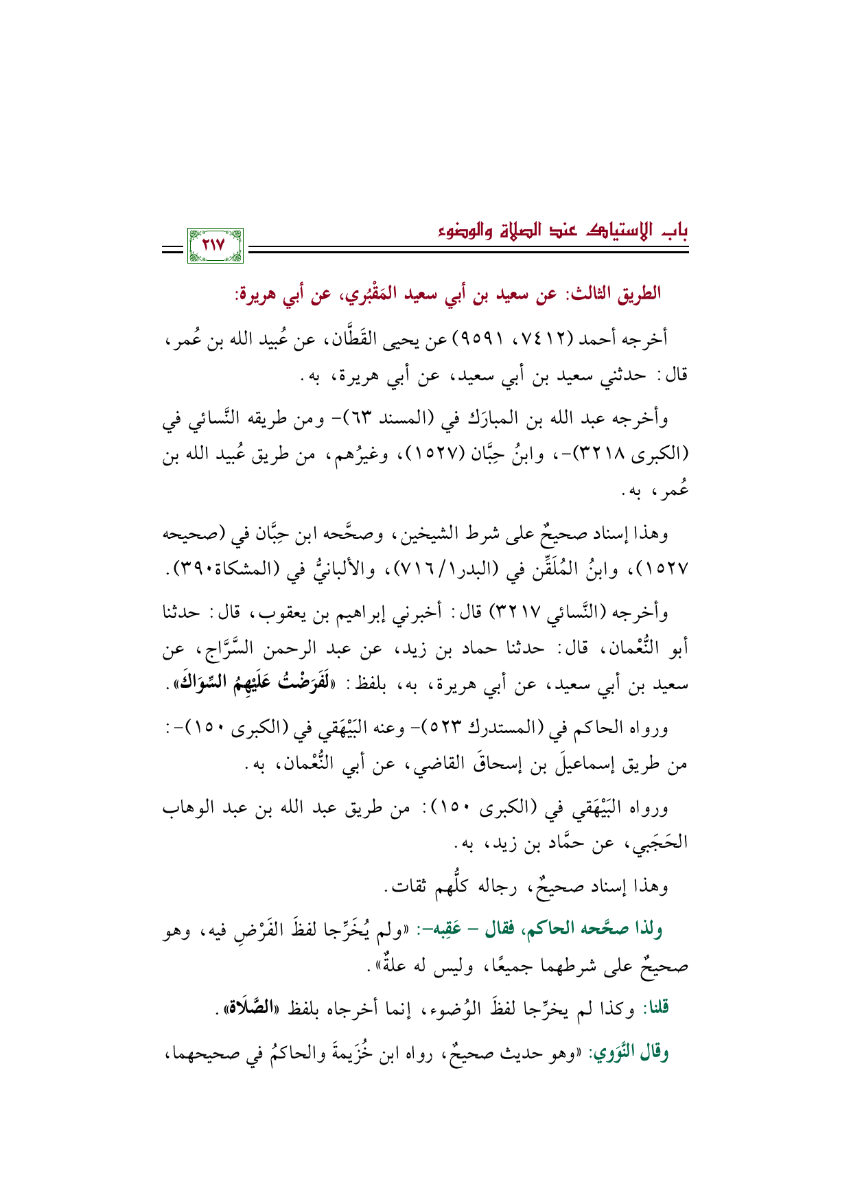* وأخرجه (النَّسائي ٣٢١٧) قال: أخبرني إبراهيم بن يعقوب، قال: حدثنا أبو النُّعْمان، قال: حدثنا حماد بن زيد، عن عبد الرحمن السَّرَّاج، عن سعيد بن أبي سعيد، عن أبي هريرة، به، بلفظ: ((لَفَرَضْتُ عَلَيْهِمُ السِّوَاكَ)).