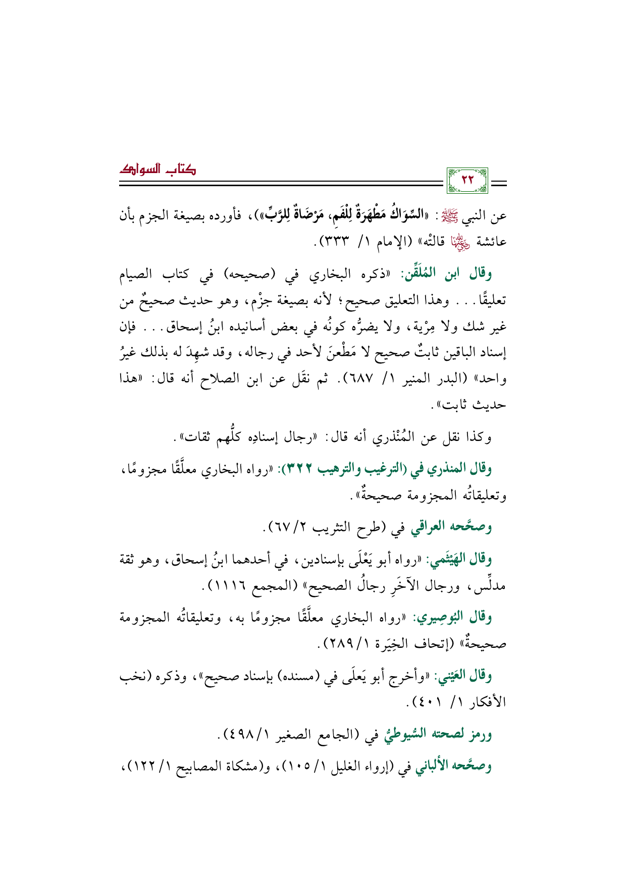 عن النبي صلى الله عليه وسلم: ((السِّوَاكُ مَطْهَرَةٌ لِلْفَمِ، مَرْضَاةٌ لِلرَّبِّ)))، فأورده بصيغة الجزم بأن عائشة رضي الله عنها قالتْه" (الإمام ١/ ٣٣٣).