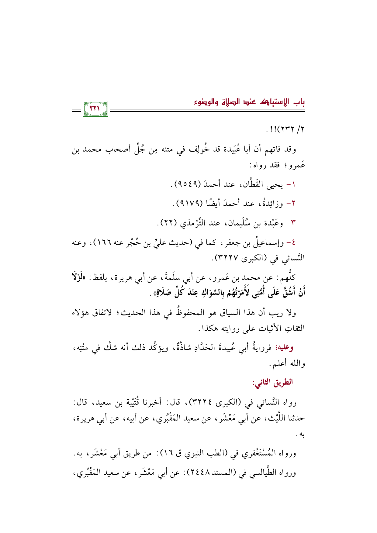 كلُّهم: عن محمد بن عَمرو، عن أبي سلَمةَ، عن أبي هريرة، بلفظ: ((لَوْلَا أَنْ أَشُقَّ عَلَى أُمَّتِي لَأَمَرْتُهُمْ بِالسِّوَاكِ عِنْدَ كُلِّ صَلَاةٍ)).