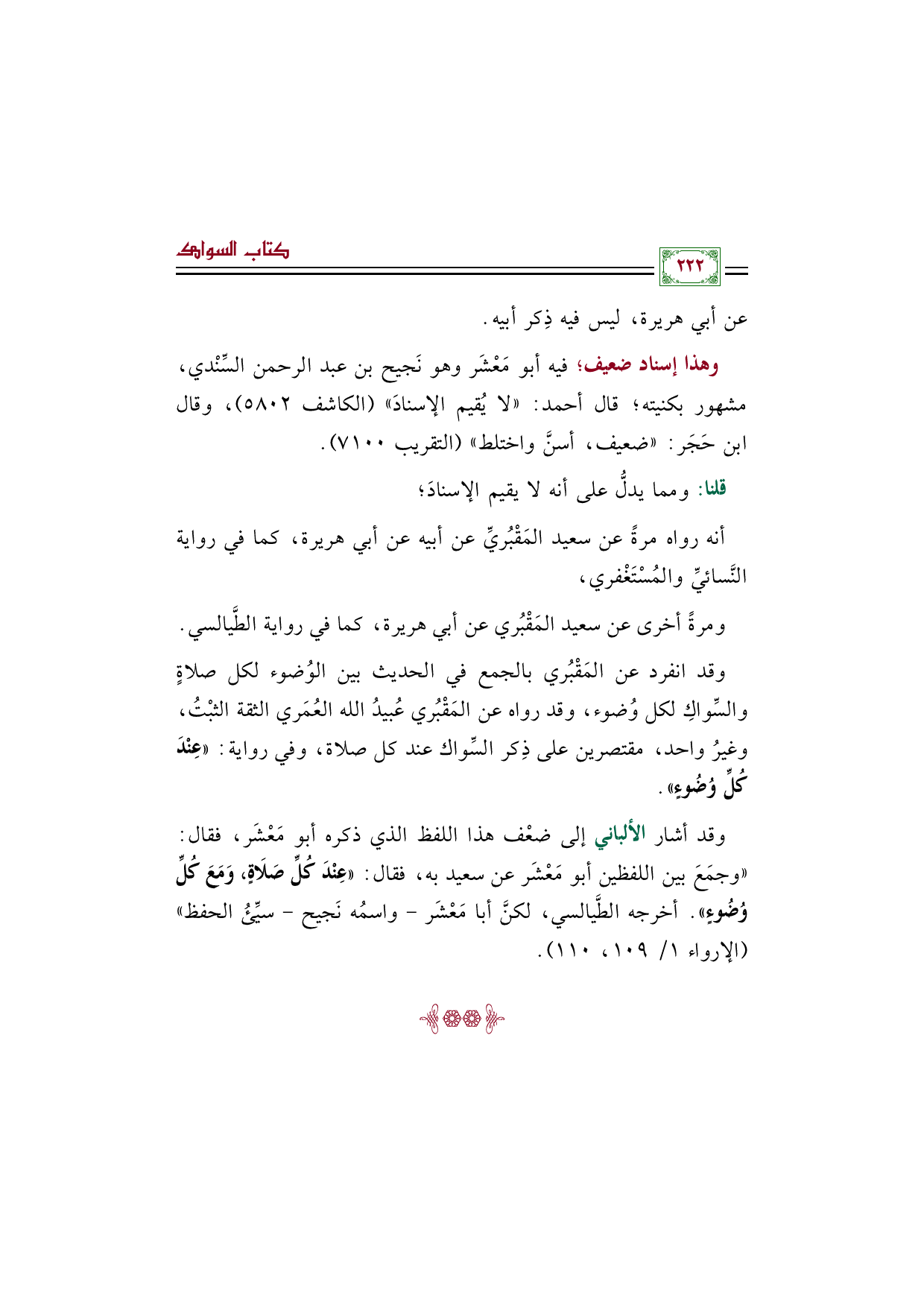 وقد أشار الألباني إلى ضعْف هذا اللفظ الذي ذكره أبو مَعْشَر، فقال: "وجمَعَ بين اللفظين أبو مَعْشَر عن سعيد به، فقال: ((عِنْدَ كُلِّ صَلَاةٍ، وَمَعَ كُلِّ وُضُوءٍ)). أخرجه الطَّيالسي، لكنَّ أبا مَعْشَر- واسمُه نَجيح- سيِّئُ الحفظ" (الإرواء ١/ ١٠٩، ١١٠).