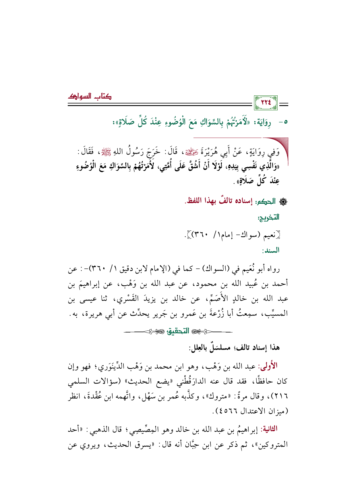 رواه أبو نُعَيم في "السواك"- كما في (الإمام لابن دقيق ١/ ٣٦٠) -: عن أحمد بن عُبيد الله بن محمود، عن عبد الله بن وَهْب، عن إبراهيمَ بن عبد الله بن خالدٍ الأَصَمِّ، عن خالد بن يزيدَ القَسْري، ثنا عيسى بن المسيِّب، سمِعتُ أبا زُرْعةَ بن عَمرو بن جَرير يحدِّث عن أبي هريرة، به.