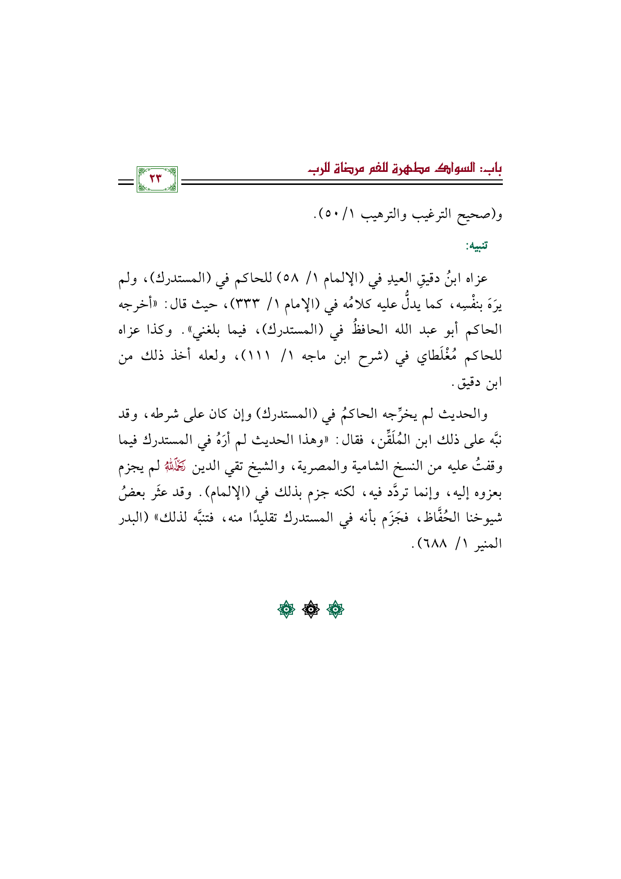 عزاه ابنُ دقيقِ العيدِ في (الإلمام ١/ ٥٨) للحاكم في "المستدرك"، ولم يرَهَ بنفْسِه، كما يدلُّ عليه كلامُه في (الإمام ١/ ٣٣٣)، حيث قال: "أخرجه الحاكم أبو عبد الله الحافظُ في "المستدرك"، فيما بلغني". وكذا عزاه للحاكم مُغْلَطاي في (شرح ابن ماجه ١/ ١١١)، ولعله أخذ ذلك من ابن دقيق.