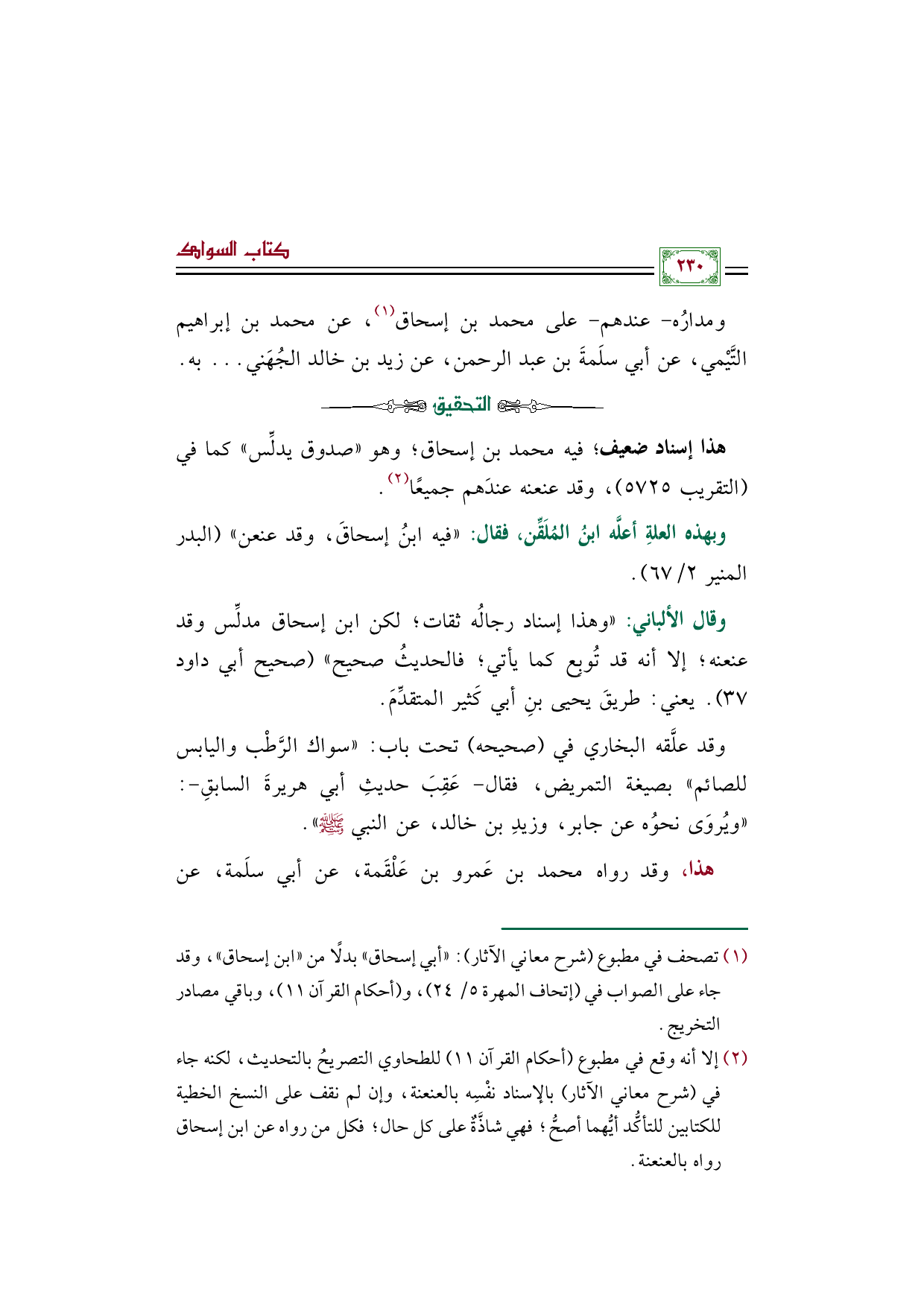 (¬٢) إلا أنه وقع في مطبوع (أحكام القرآن ١١) للطحاوي التصريحُ بالتحديث، لكنه جاء في (شرح معاني الآثار) بالإسناد نفْسِه بالعنعنة، وإن لم نقف على النسخ الخطية للكتابين للتأكُّد أيُّهما أصحُّ؛ فهي شاذَّةٌ على كل حال؛ فكل من رواه عن ابن إسحاق رواه بالعنعنة.