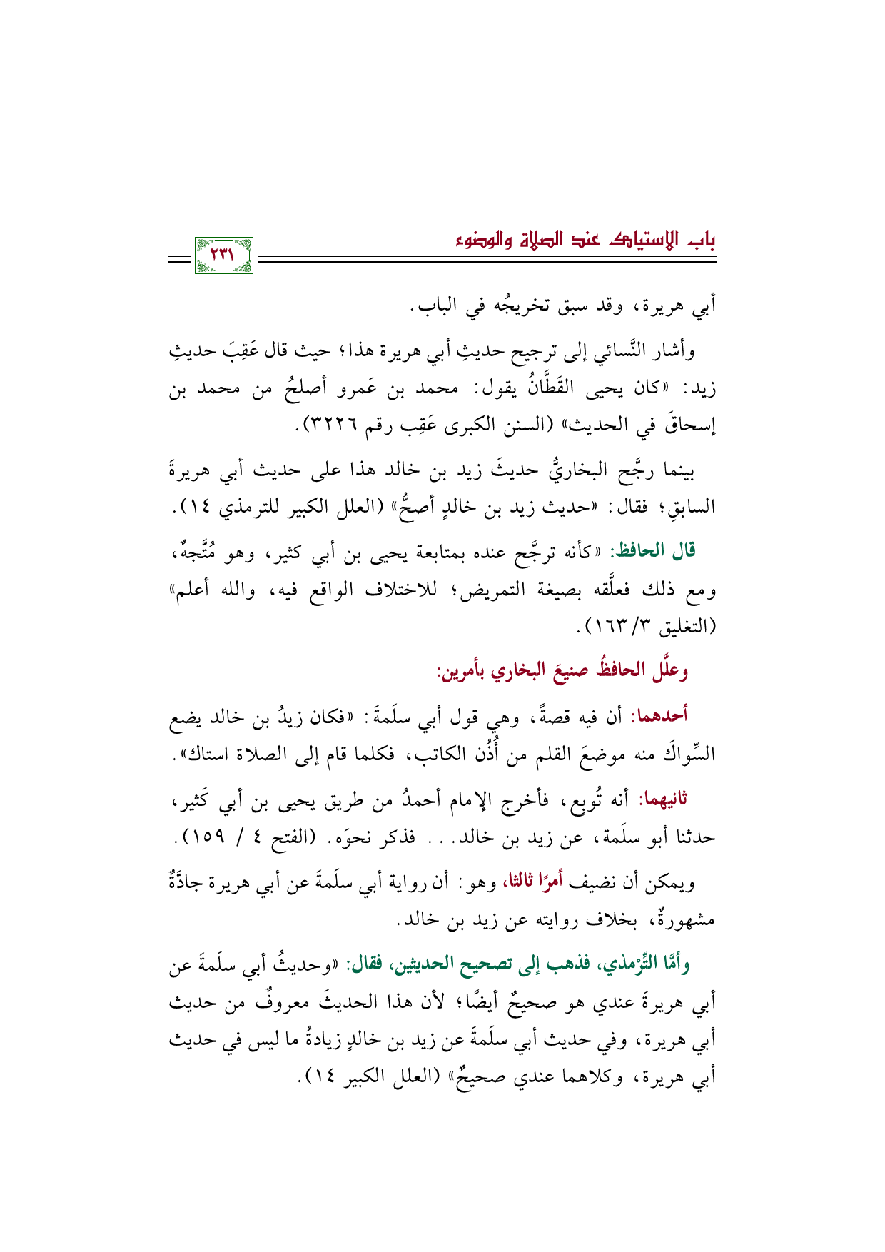 وأشار النَّسائي إلى ترجيح حديثِ أبي هريرة هذا؛ حيث قال عَقِبَ حديثِ زيد: "كان يحيى القَطَّانُ يقول: محمد بن عَمرو أصلحُ من محمد بن إسحاقَ في الحديث" (السنن الكبرى عَقِب رقم ٣٢٢٦).