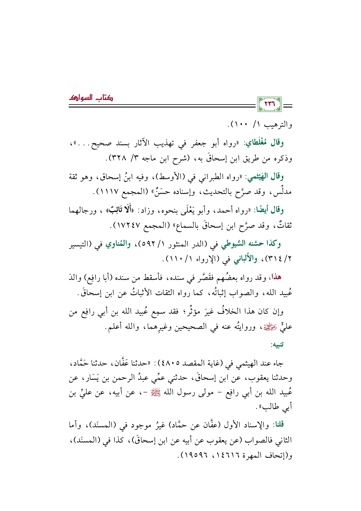هذا، وقد رواه بعضُهم فقَصَّر في سنده، فأسقط من سنده (أبا رافِع) والدَ عُبيد الله، والصواب إثباتُه، كما رواه الثقات الأثباتُ عن ابن إسحاقَ.