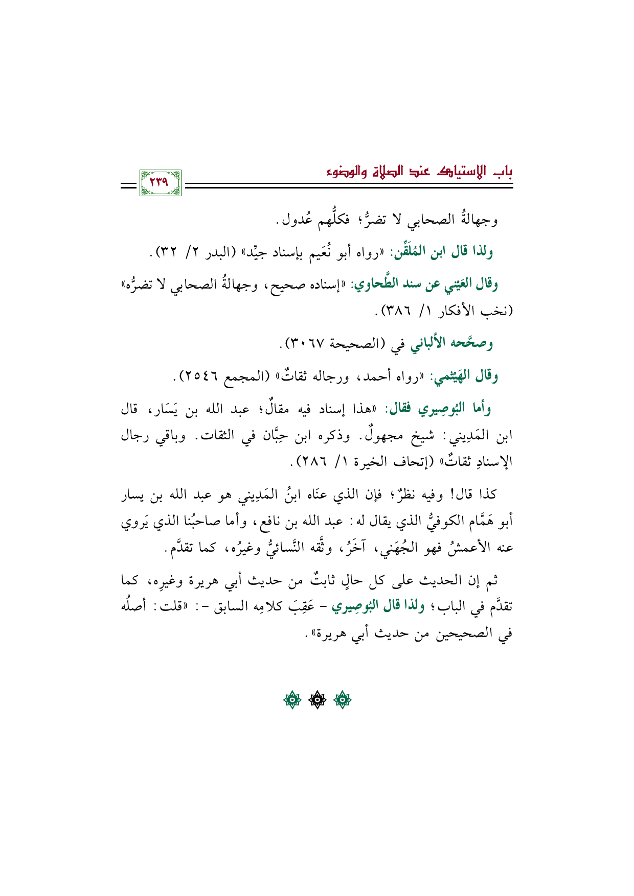 وجهالةُ الصحابي لا تضرُّ؛ فكلُّهم عُدول.