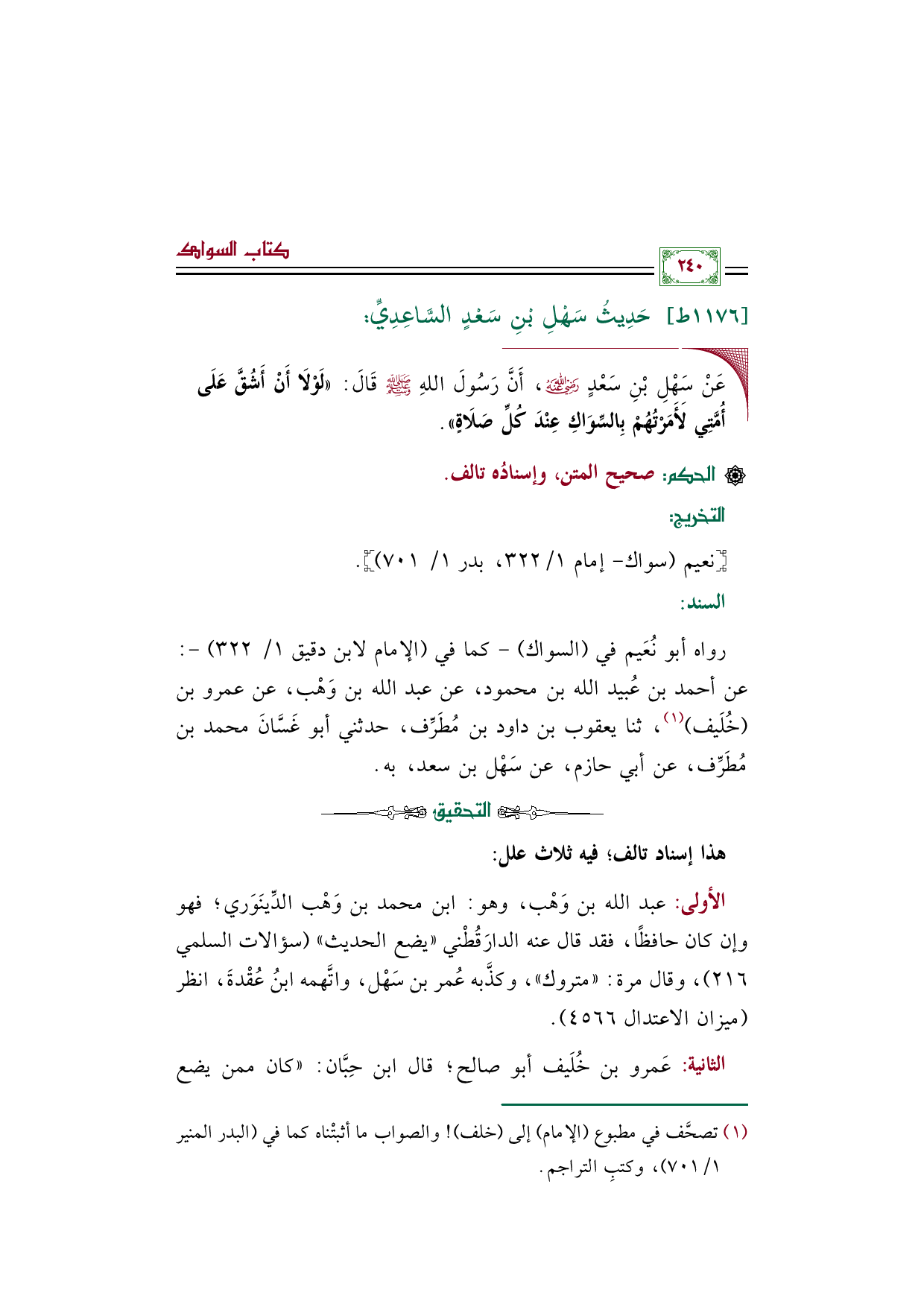 رواه أبو نُعَيم في "السواك"- كما في (الإمام لابن دقيق ١/ ٣٢٢) -: عن أحمد بن عُبيد الله بن محمود، عن عبد الله بن وَهْب، عن عمرو بن (خُلَيف) (¬١)، ثنا يعقوب بن داود بن مُطَرِّف، حدثني أبو غَسَّانَ محمد بن مُطَرِّف، عن أبي حازم، عن سَهْل بن سعد، به.