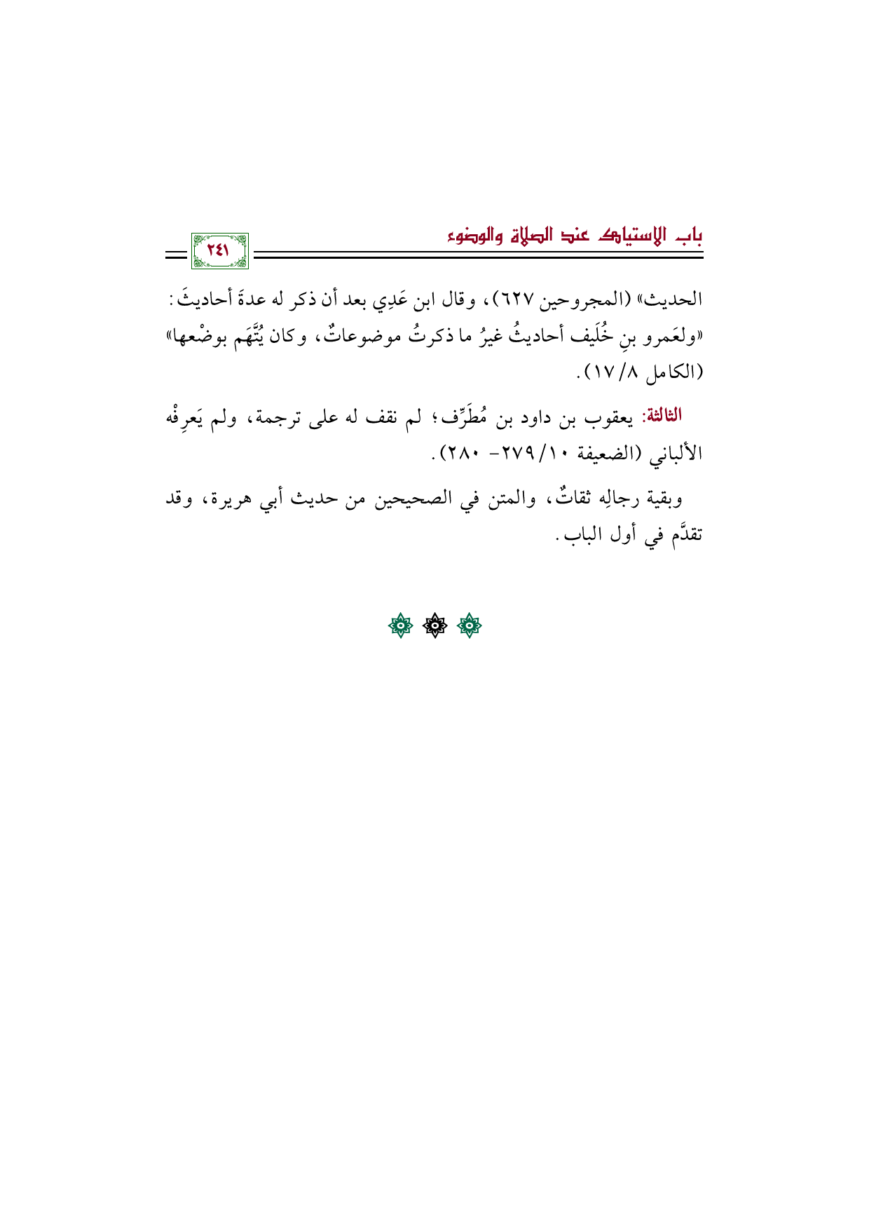 الثالث: يعقوب بن داود بن مُطَرِّف؛ لم نقف له على ترجمة, ولم يَعرِفْه الألباني (الضعيفة ١٠/ ٢٧٩ - ٢٨٠).