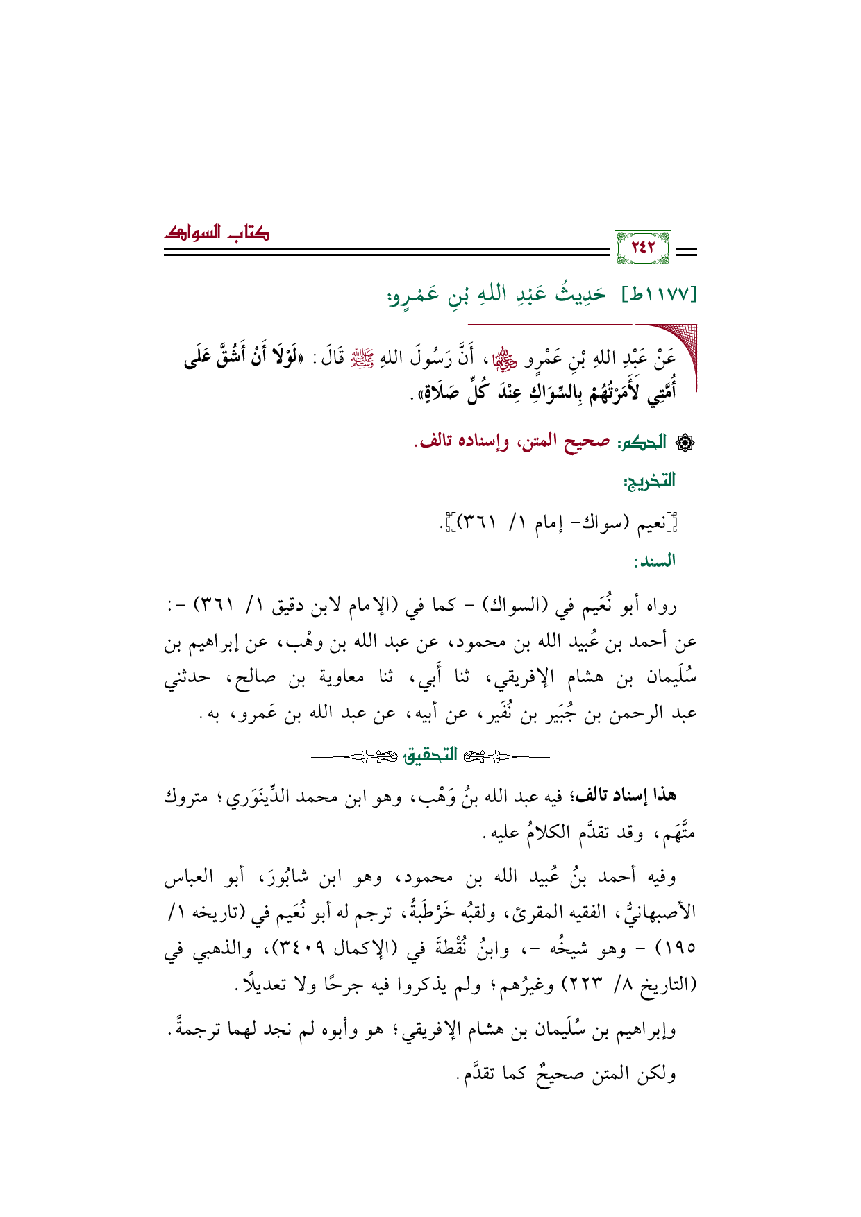رواه أبو نُعَيم في "السواك"- كما في (الإمام لابن دقيق ١/ ٣٦١) -: عن أحمد بن عُبيد الله بن محمود، عن عبد الله بن وهْب، عن إبراهيم بن سُلَيمان بن هشام الإفريقي، ثنا أَبي، ثنا معاوية بن صالح، حدثني عبد الرحمن بن جُبَير بن نُفَير، عن أبيه، عن عبد الله بن عَمرو، به.