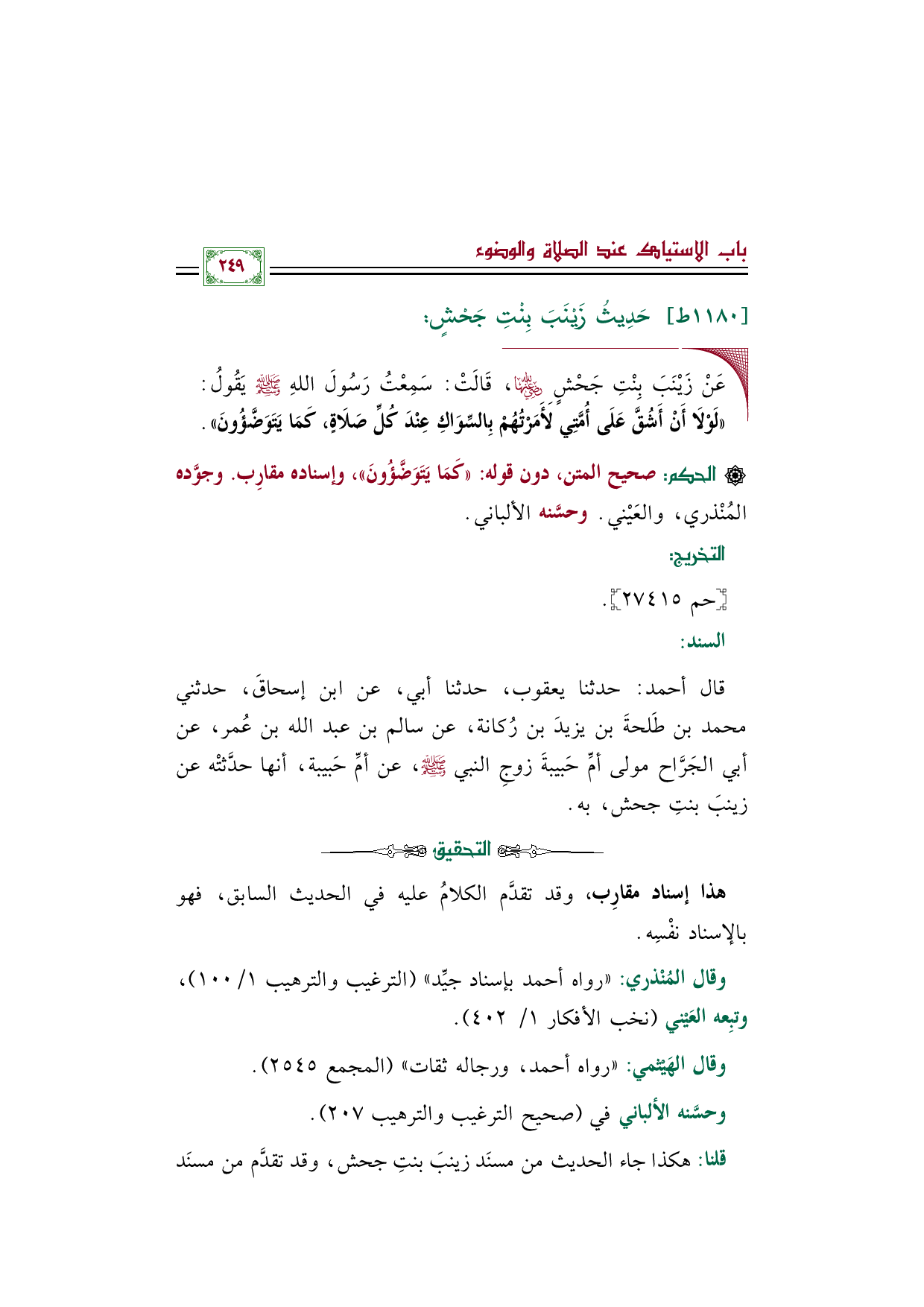 قال أحمد: حدثنا يعقوب، حدثنا أبي، عن ابن إسحاقَ، حدثني محمد بن طَلحةَ بن يزيدَ بن رُكانة، عن سالم بن عبد الله بن عُمر، عن أبي الجَرَّاح مولى أمِّ حَبيبةَ زوجِ النبي صلى الله عليه وسلم، عن أمِّ حَبيبة، أنها حدَّثتْه عن زينبَ بنتِ جحش، به.