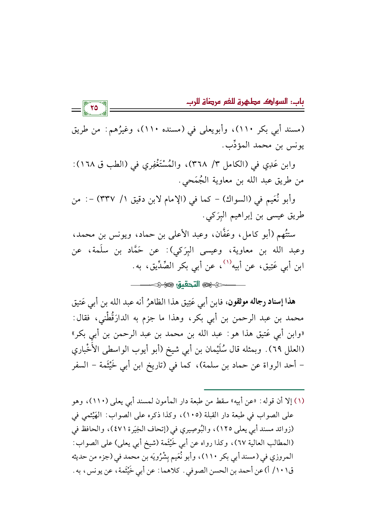 (¬١) إلا أن قوله: "عن أبيه" سقط من طبعة دار المأمون لمسند أبي يعلى (١١٠)، وهو على الصواب في طبعة دار القبلة (١٠٥)، وكذا ذكره على الصواب: الهَيْثمي في (زوائد مسند أبي يعلى ١٢٥)، والبُوصِيري في (إتحاف الخِيَرة ٤٧١)، والحافظ في (المطالب العالية ٦٧)، وكذا رواه عن أبي خَيْثَمة (شيخ أبي يعلى) على الصواب: المروزي في (مسند أبي بكر ١١٠)، وأبو نُعَيم بِشْرُويَه بن محمد في (جزء من حديثه ق ١٠١ أ) عن أحمد بن الحسن الصوفي. كلاهما: عن أبي خَيْثَمة، عن يونس، به.