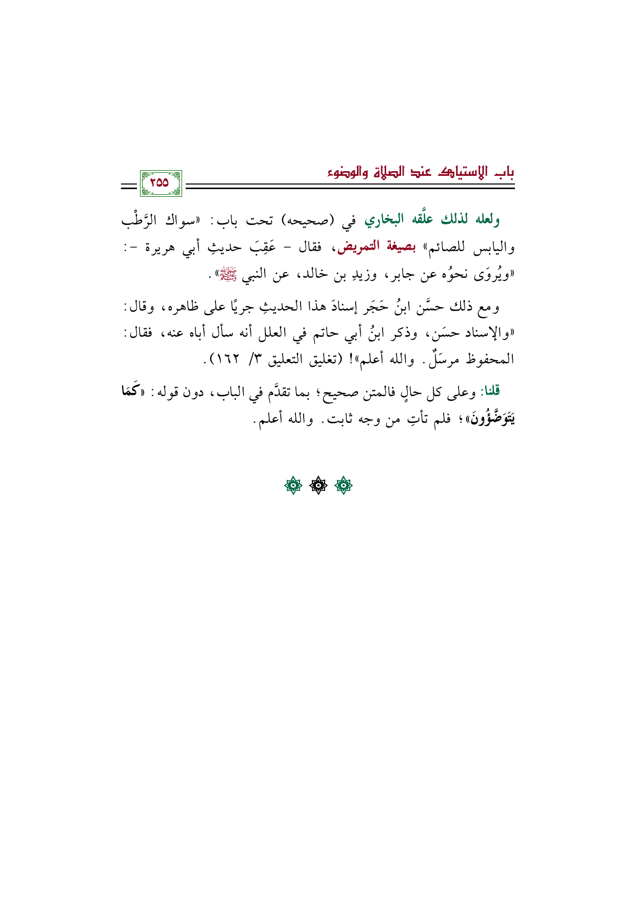 ولعله لذلك علَّقه البخاري في "صحيحه" تحت باب: "سواك الرَّطْب واليابس للصائم" بصيغة التمريض، فقال- عَقِبَ حديثِ أبي هريرة-: "ويُروَى نحوُه عن جابر، وزيدِ بن خالد، عن النبي صلى الله عليه وسلم".