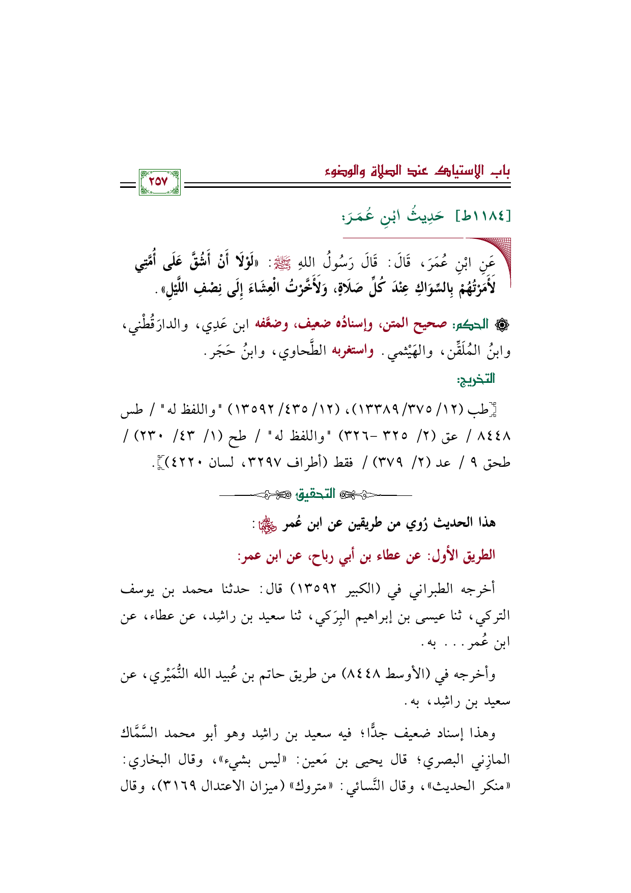 أخرجه الطبراني في (الكبير ١٣٥٩٢) قال: حدثنا محمد بن يوسف التركي، ثنا عيسى بن إبراهيم البِرَكي، ثنا سعيد بن راشِد، عن عطاء، عن ابن عُمر ... به.