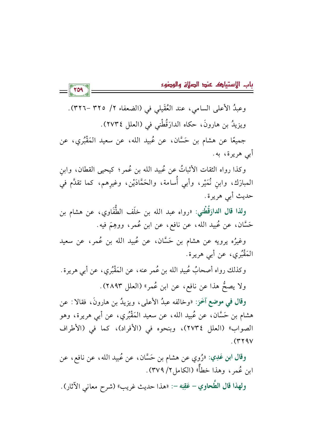 وقال في موضع آخَرَ: "وخالفه عبدُ الأعلى، ويزيدُ بن هارونَ، فقالا: عن هشام بن حَسَّان، عن عُبيد الله، عن سعيد المَقْبُري، عن أبي هريرة، وهو الصواب" (العلل ٢٧٣٤)، وبنحوه في (الأفراد)، كما في (الأطراف ٣٢٩٧).