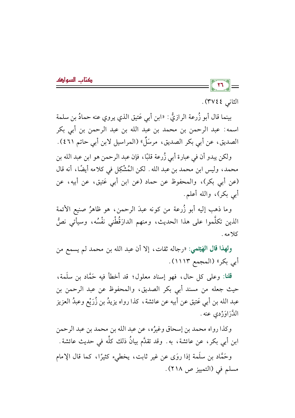 ولكن يبدو أن في عبارة أبي زُرعة قلبًا، فإن عبد الرحمن هو ابن عبد الله بن محمد، وليس ابن محمد بن عبد الله. لكن المُشْكِل في كلامه أيضًا، أنه قال (عن أبي بكر)، والمحفوظ عن حماد (عن ابن أبي عَتيق، عن أبيه، عن أبي بكر)، والله أعلم.