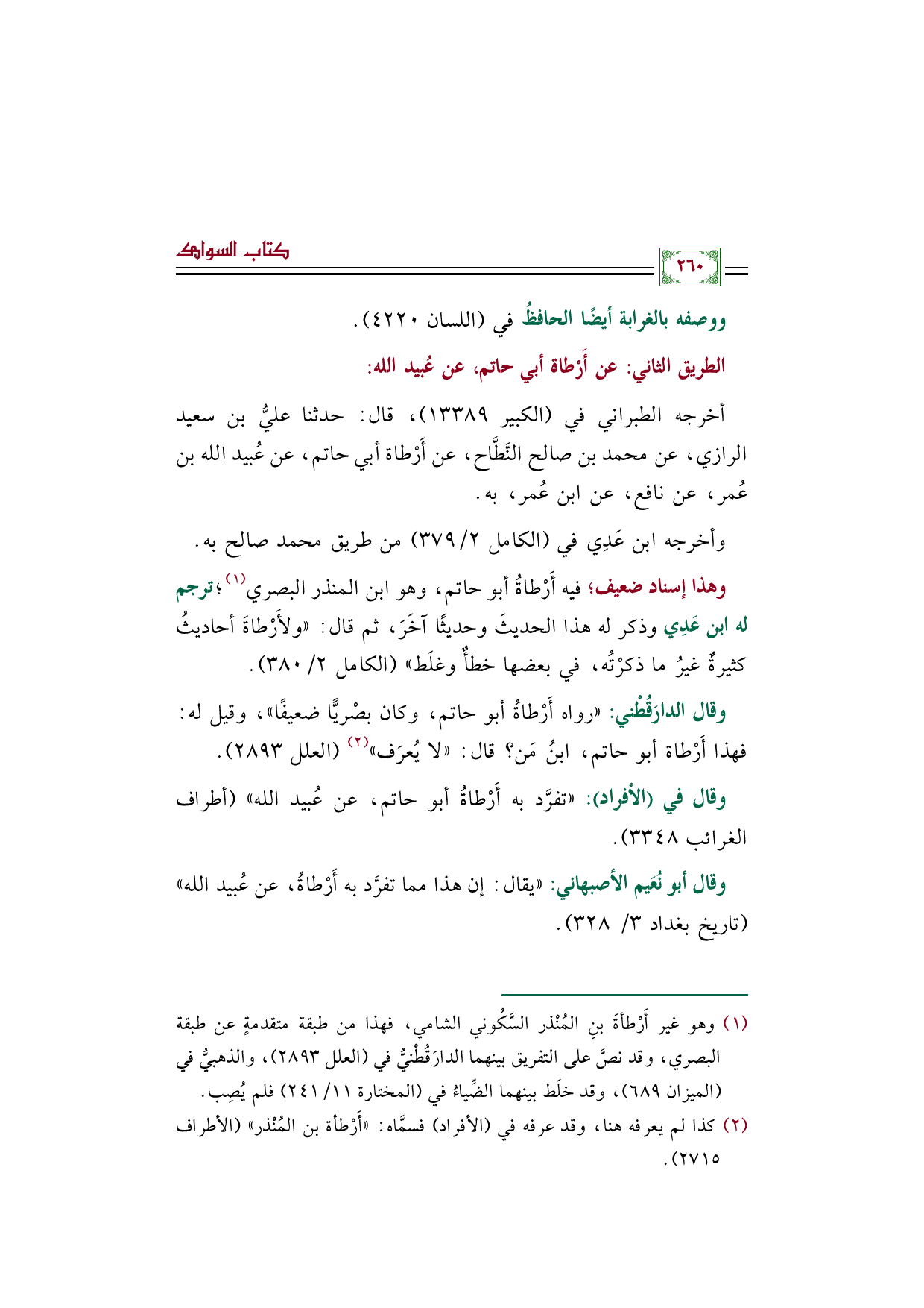 (¬١) وهو غير أَرْطأةَ بنِ المُنْذر السَّكُوني الشامي، فهذا من طبقة متقدمةٍ عن طبقة البصري، وقد نصَّ على التفريق بينهما الدارَقُطْنيُّ في (العلل ٢٨٩٣)، والذهبيُّ في (الميزان ٦٨٩)، وقد خلَط بينهما الضِّياءُ في (المختارة ١١/ ٢٤١) فلم يُصِب.