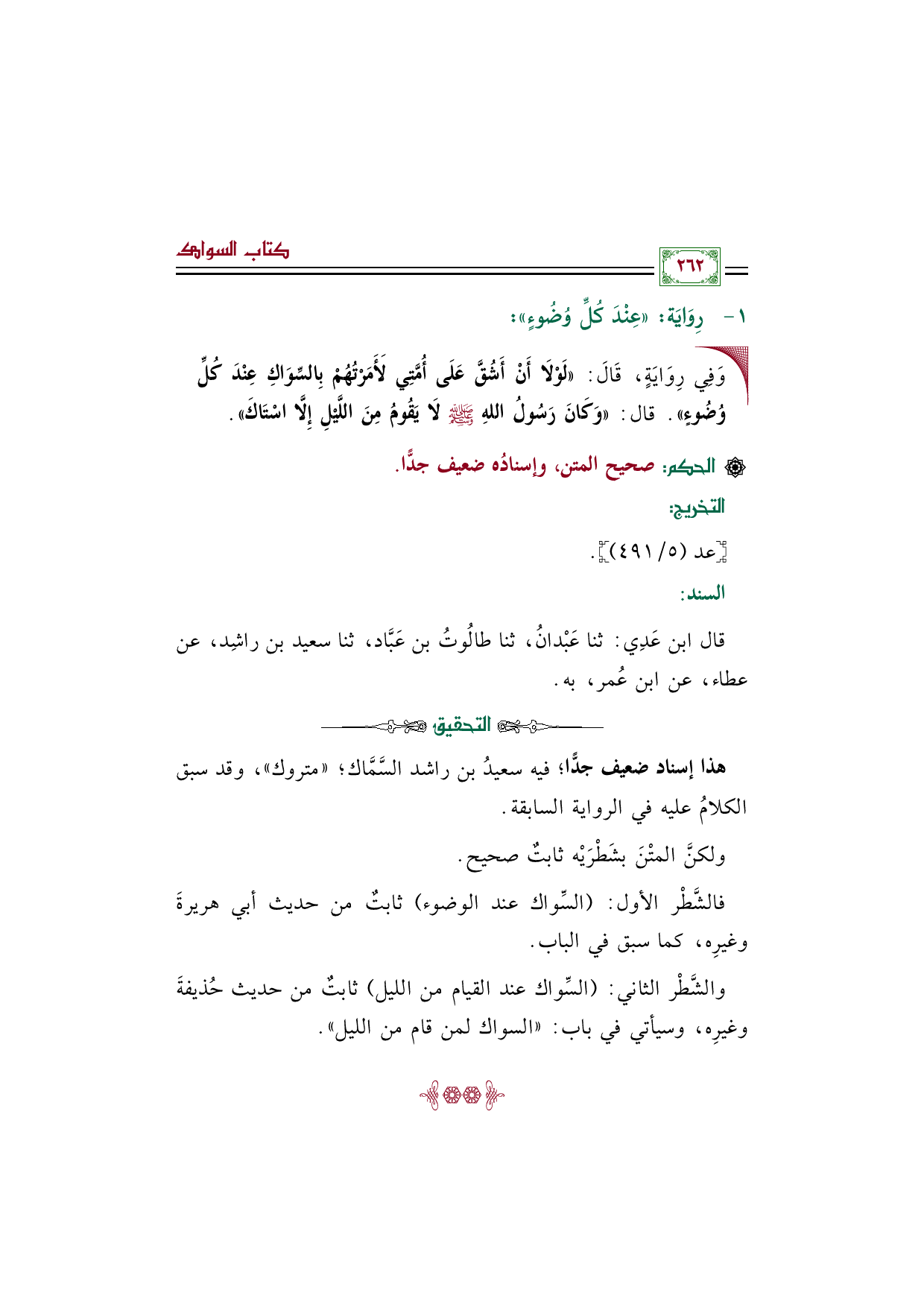 فالشَّطْر الأول: (السِّواك عند الوضوء) ثابتٌ من حديث أبي هريرةَ وغيرِه، كما سبق في الباب.