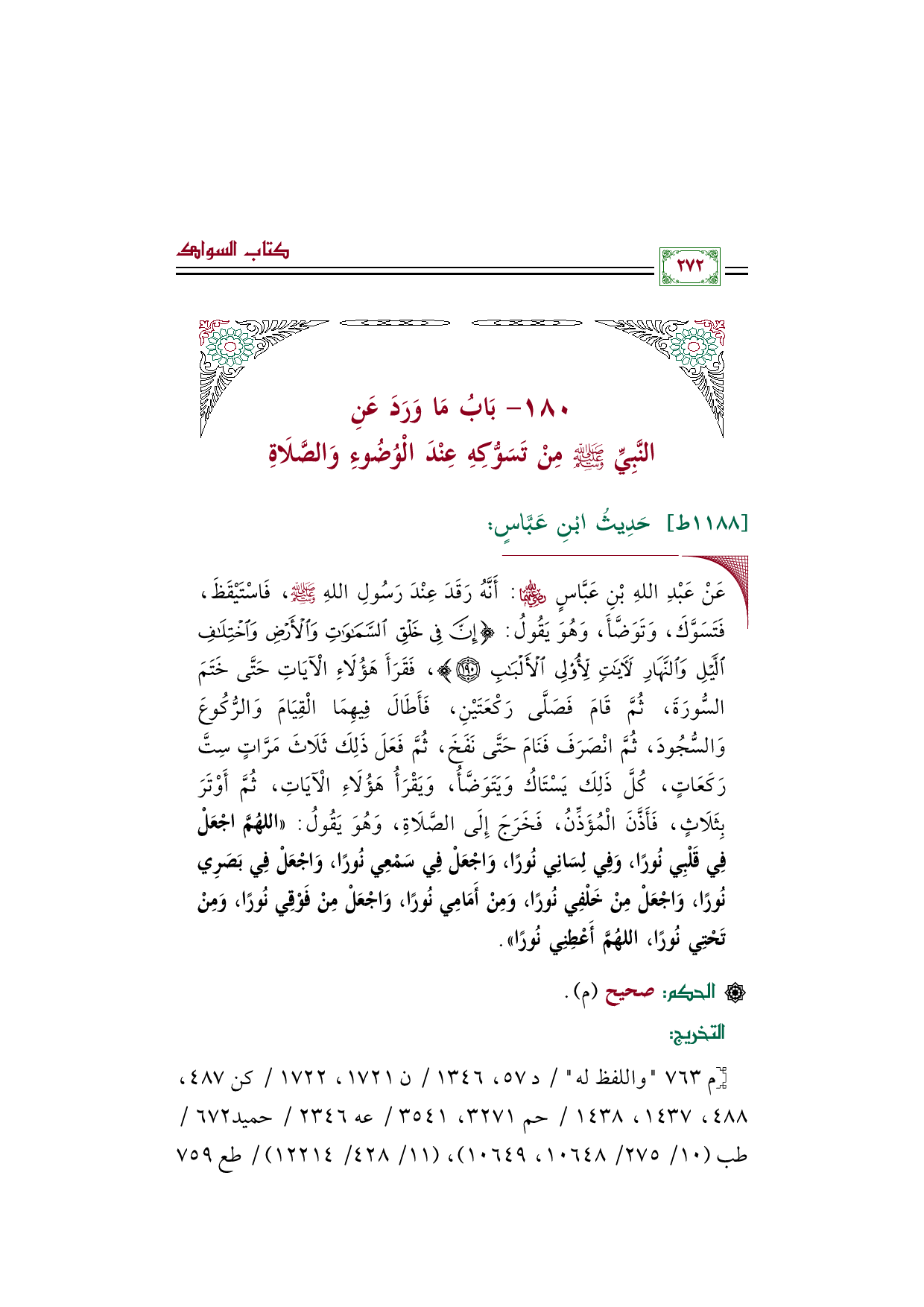 ١٨٠ - بَابُ مَا وَرَدَ عَنِ النَّبِيِّ صَلَّى اللهُ عَلَيْهِ وَسَلَّمَ مِنْ تَسَوُّكِهِ عِنْدَ الْوُضُوءِ وَالصَّلَاةِ
