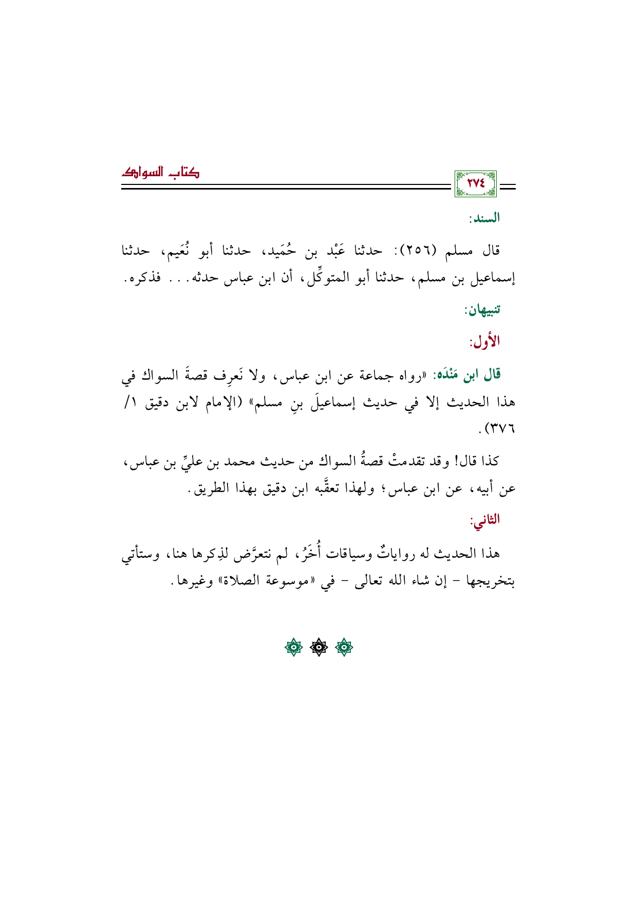 قال ابن مَنْدَه: "رواه جماعة عن ابن عباس، ولا نَعرِف قصةَ السواك في هذا الحديث إلا في حديث إسماعيلَ بنِ مسلم" (الإمام لابن دقيق ١/ ٣٧٦).