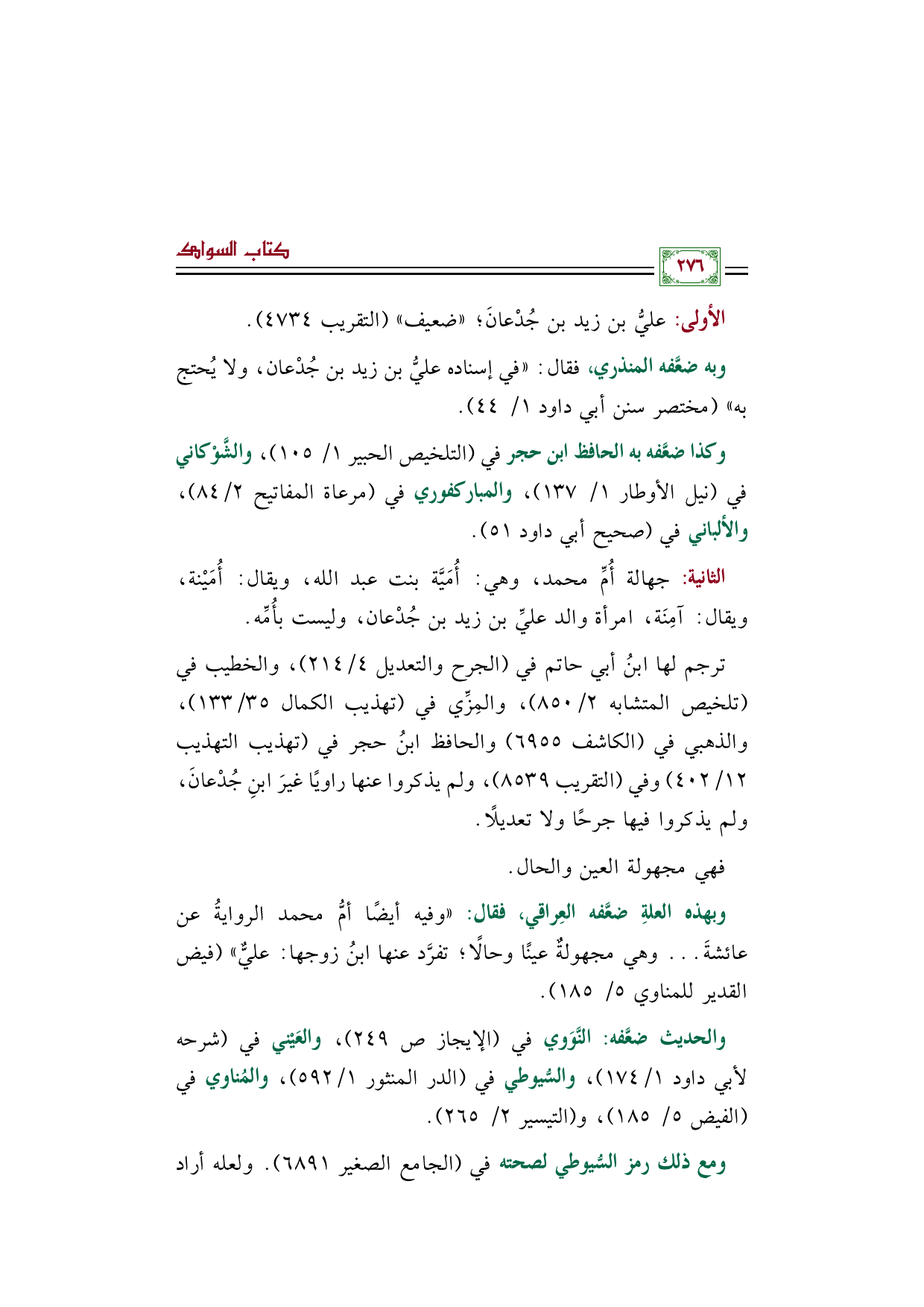 وبهذه العلةِ ضعَّفه العِراقي، فقال: "وفيه أيضًا أمُّ محمد الروايةُ عن عائشةَ ... وهي مجهولةٌ عينًا وحالًا؛ تفرَّد عنها ابنُ زوجها: عليٌّ" (فيض القدير للمناوي ٥/ ١٨٥).