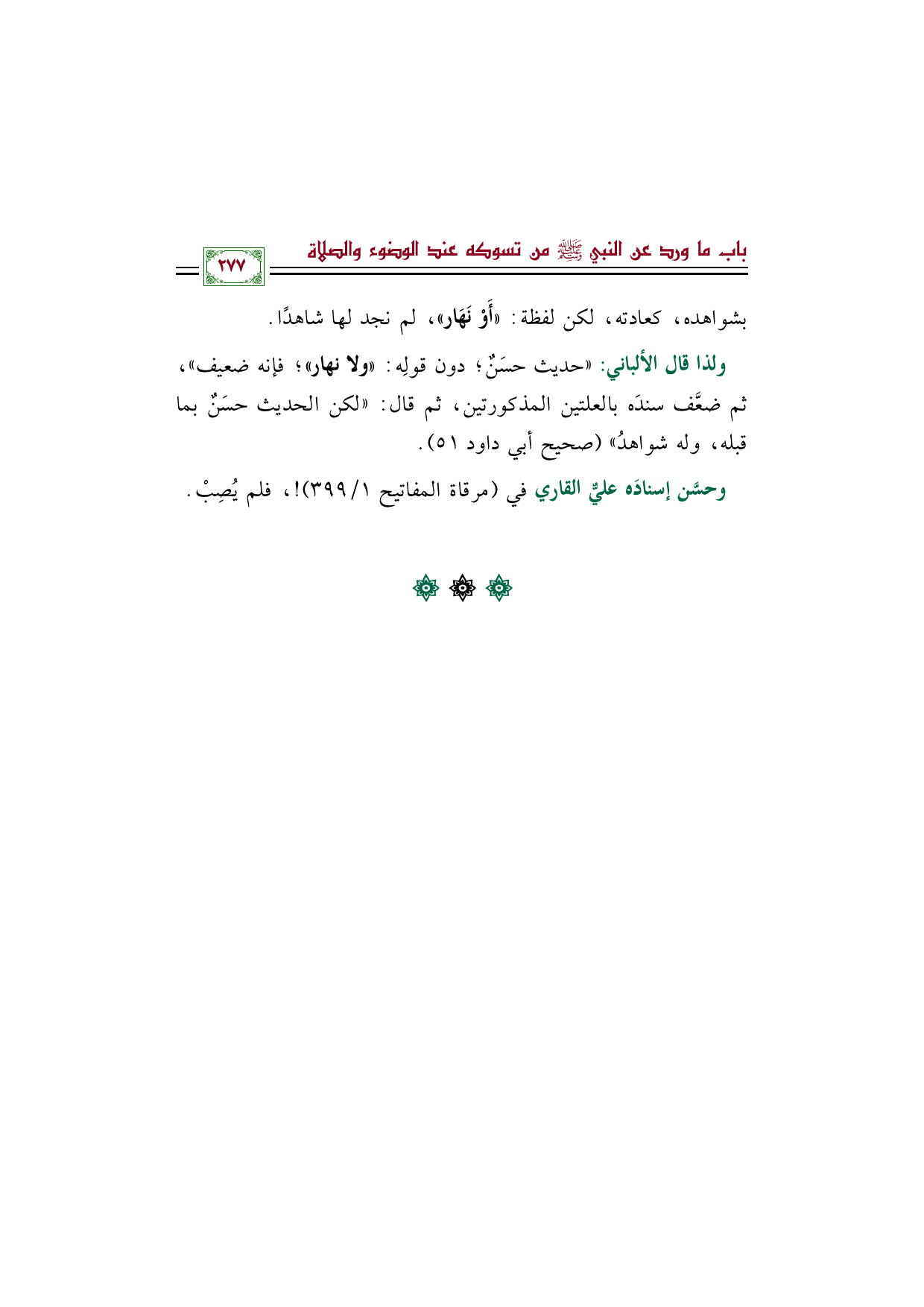 ولذا قال الألباني: "حديث حسَنٌ؛ دون قولِه: ((ولا نهار))؛ فإنه ضعيف"، ثم ضعَّف سندَه بالعلتين المذكورتين، ثم قال: "لكن الحديث حسَنٌ بما قبله، وله شواهدُ" (صحيح أبي داود ٥١).