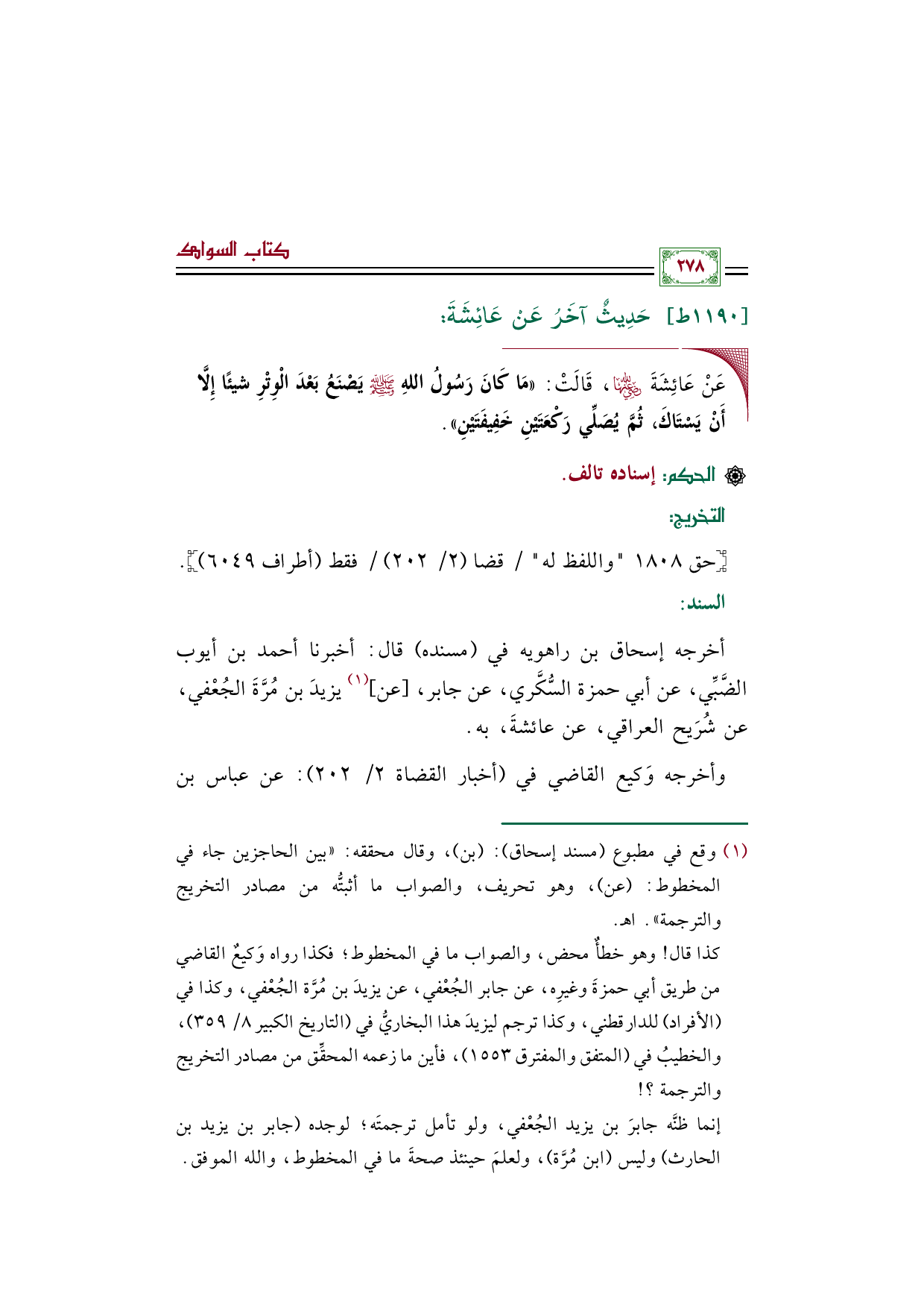 أخرجه إسحاق بن راهويه في (مسنده) قال: أخبرنا أحمد بن أيوب الضَّبِّي، عن أبي حمزة السُّكَّري، عن جابر، [عن] (¬١) يزيدَ بن مُرَّةَ الجُعْفي، عن شُرَيح العراقي، عن عائشةَ، به.