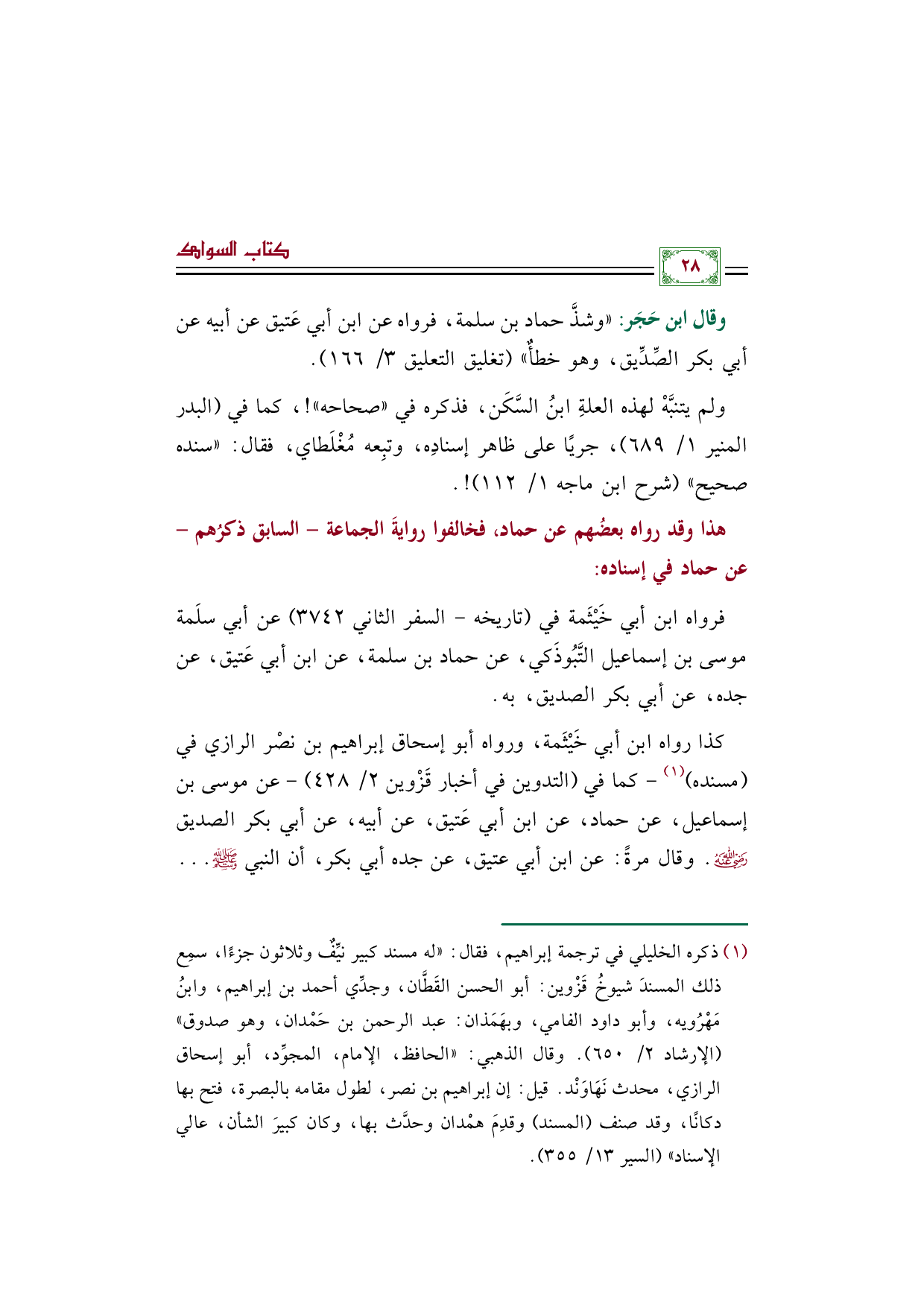 * وقال ابن حَجَر: "وشذَّ حماد بن سلمة، فرواه عن ابن أبي عَتيق عن أبيه عن أبي بكر الصِّدِّيق، وهو خطأٌ" (تغليق التعليق ٣/ ١٦٦).