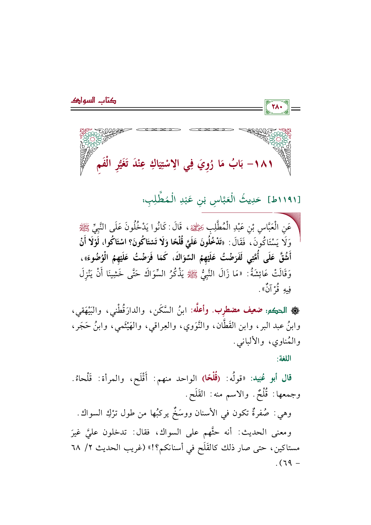 ومعنى الحديث: أنه حثَّهم على السواك، فقال: تدخلون عليَّ غيرَ مستاكين، حتى صار ذلك كالقَلَح في أسنانكم؟ ! " (غريب الحديث ٢/ ٦٨ - ٦٩).