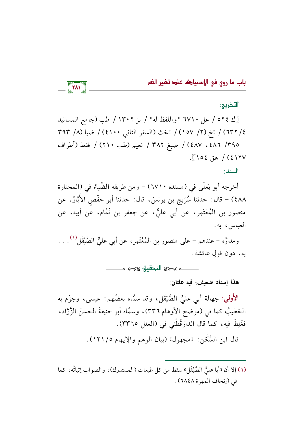 الأولى: جهالة أبي عليٍّ الصَّيْقَل، وقد سمَّاه بعضُهم: عيسى، وجزَم به الخطيبُ كما في (موضح الأوهام ٣٣٦)، وسمَّاه أبو حنيفةَ الحسنَ الزَّرَّاد، فغَلِطَ فيه، كما قال الدارَقُطْني في (العلل ٣٣٦٥).