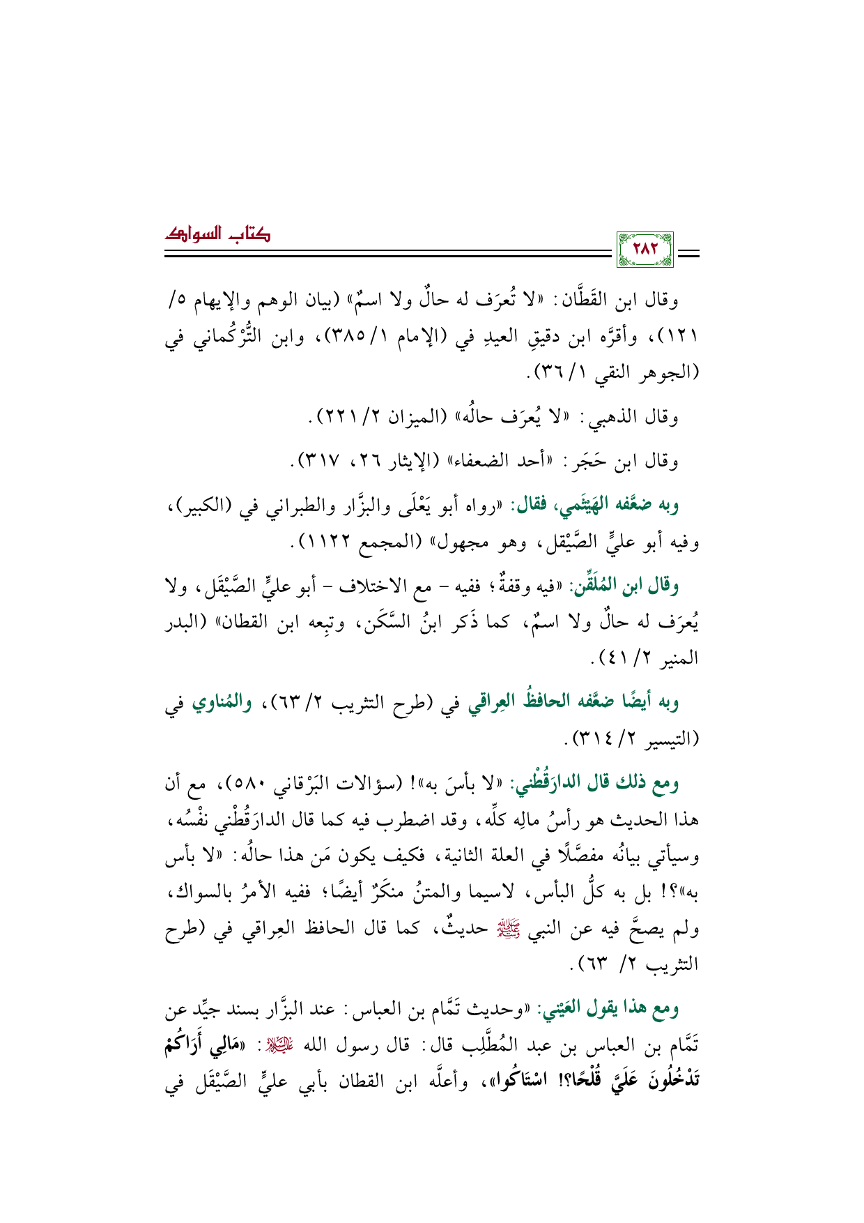 ومع هذا يقول العَيْني: "وحديث تَمَّام بن العباس: عند البزَّار بسند جيِّد عن تَمَّام بن العباس بن عبد المُطَّلِب قال: قال رسول الله عليه السلام: ((مَالِي أَرَاكُمْ تَدْخُلُونَ عَلَيَّ قُلْحًا؟ ! اسْتَاكُوا))، وأعلَّه ابن القطان بأبي عليٍّ الصَّيْقَل في