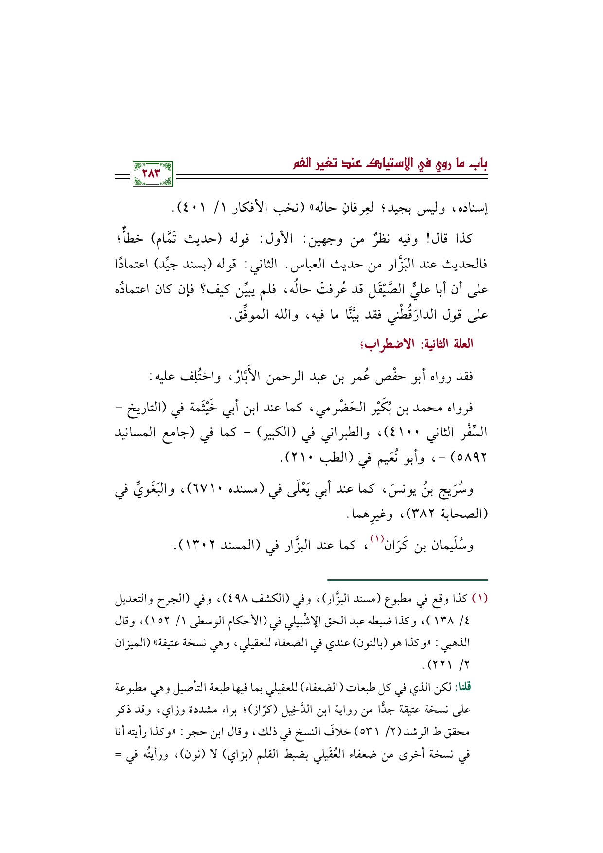 (¬١) كذا وقع في مطبوع "مسند البزَّار"، وفي (الكشف ٤٩٨)، وفي (الجرح والتعديل ٤/ ١٣٨)، وكذا ضبطه عبد الحق الإشْبيلي في (الأحكام الوسطى ١/ ١٥٢)، وقال الذهبي: "وكذا هو (بالنون) عندي في الضعفاء للعقيلي، وهي نسخة عتيقة" (الميزان ٢/ ٢٢١)، قلنا: لكن الذي في كل طبعات الضعفاء للعقيلي بما فيها طبعة التأصيل وهي مطبوعة على نسخة عتيقة جدًّا من رواية ابن الدَّخِيل (كرّاز)؛ براء مشددة وزاي، وقد ذكر محقق ط الرشد (٢/ ٥٣١) خلافَ النسخ في ذلك، وقال ابن حجر: "وكذا رأيته أنا في نسخة أخرى من ضعفاء العُقَيلي بضبط القلم (بزاي) لا (نون)، ورأيتُه في كامل ابن عَدِي بالوجهين" (لسان الميزان ٤/ ١٧٠). قلنا: وكذا ضبطه الدارَقُطْني في (المؤتلف والمختلف ٤/ ١٩٨١)، وابن ماكولا في (الإكمال ٧/ ١٣٤) "براء مشددة وزاي"، وصوَّبه ابن القطان في (بيان الوهم والأوهام ٢/ ٢١٩)، وتبِعه ابن دقيق في (الإمام ١/ ٣٨٦). فالله أعلم.