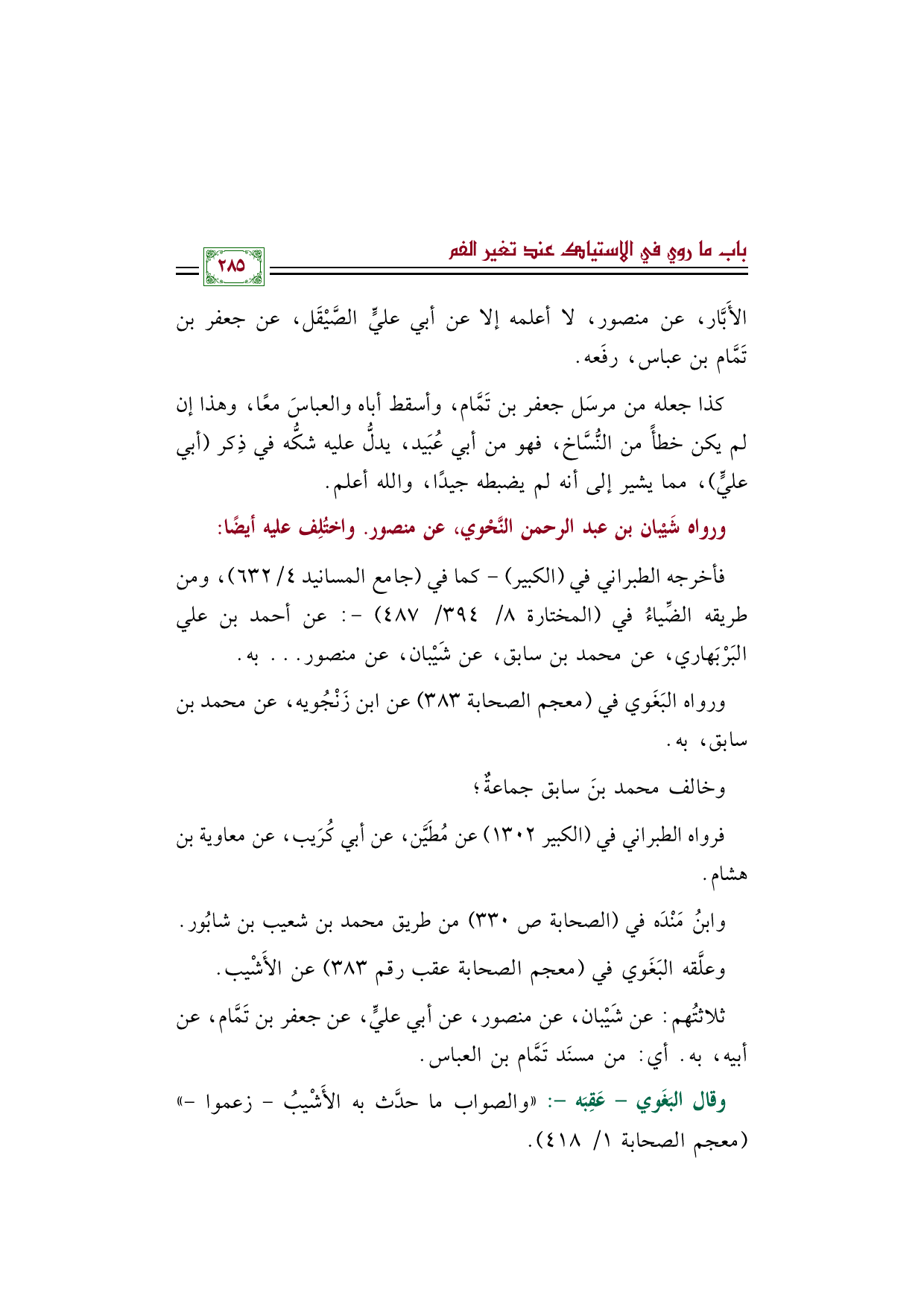 ثلاثتُهم: عن شَيْبان، عن منصور، عن أبي عليٍّ، عن جعفر بن تَمَّام، عن أبيه، به. أي: من مسنَد تَمَّام بن العباس.
